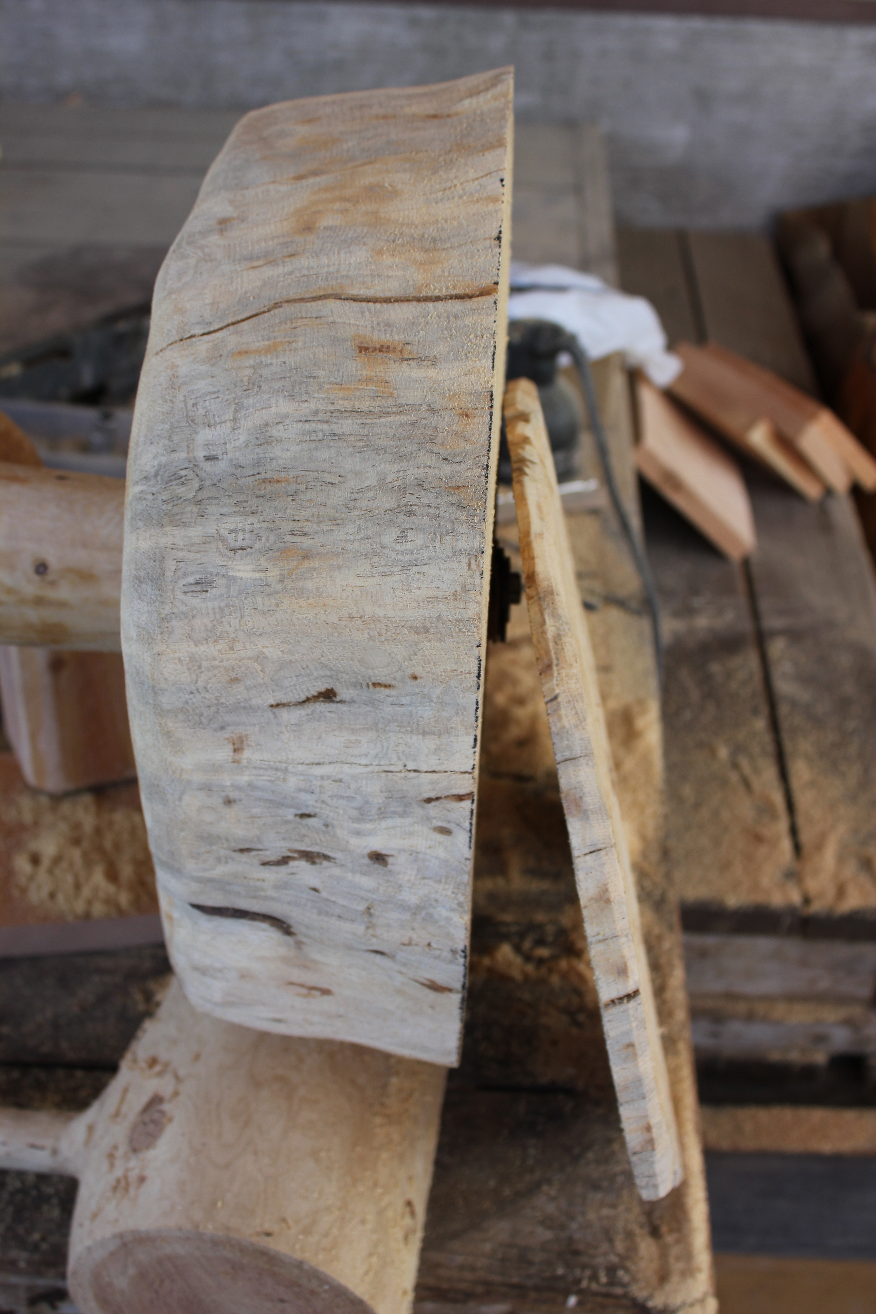 A side view showing the thinness of the removed piece and the flatness of the hall tree base. It was a tedious sawing job, but I couldn’t think of a better, less risky, way to do it.