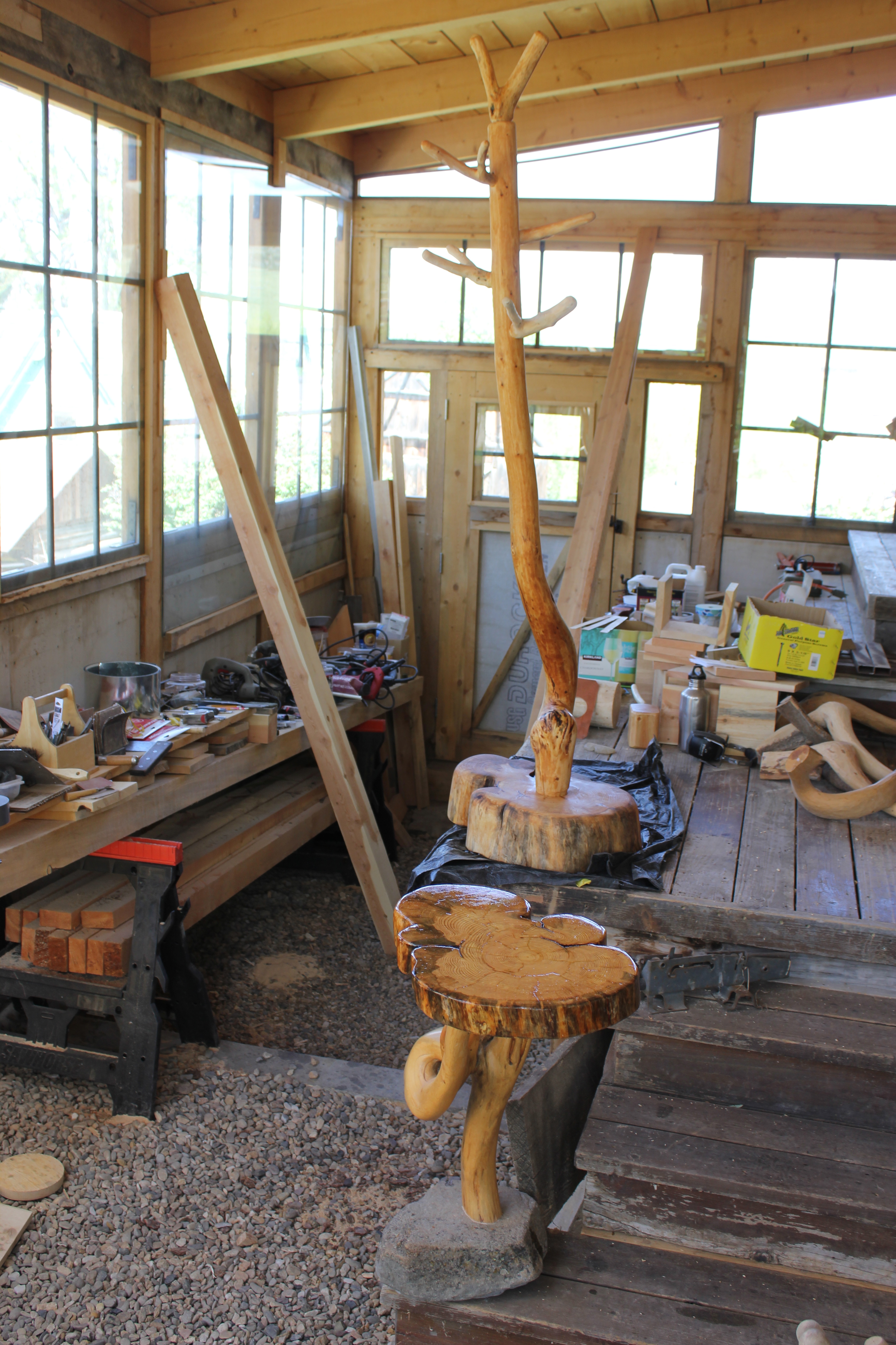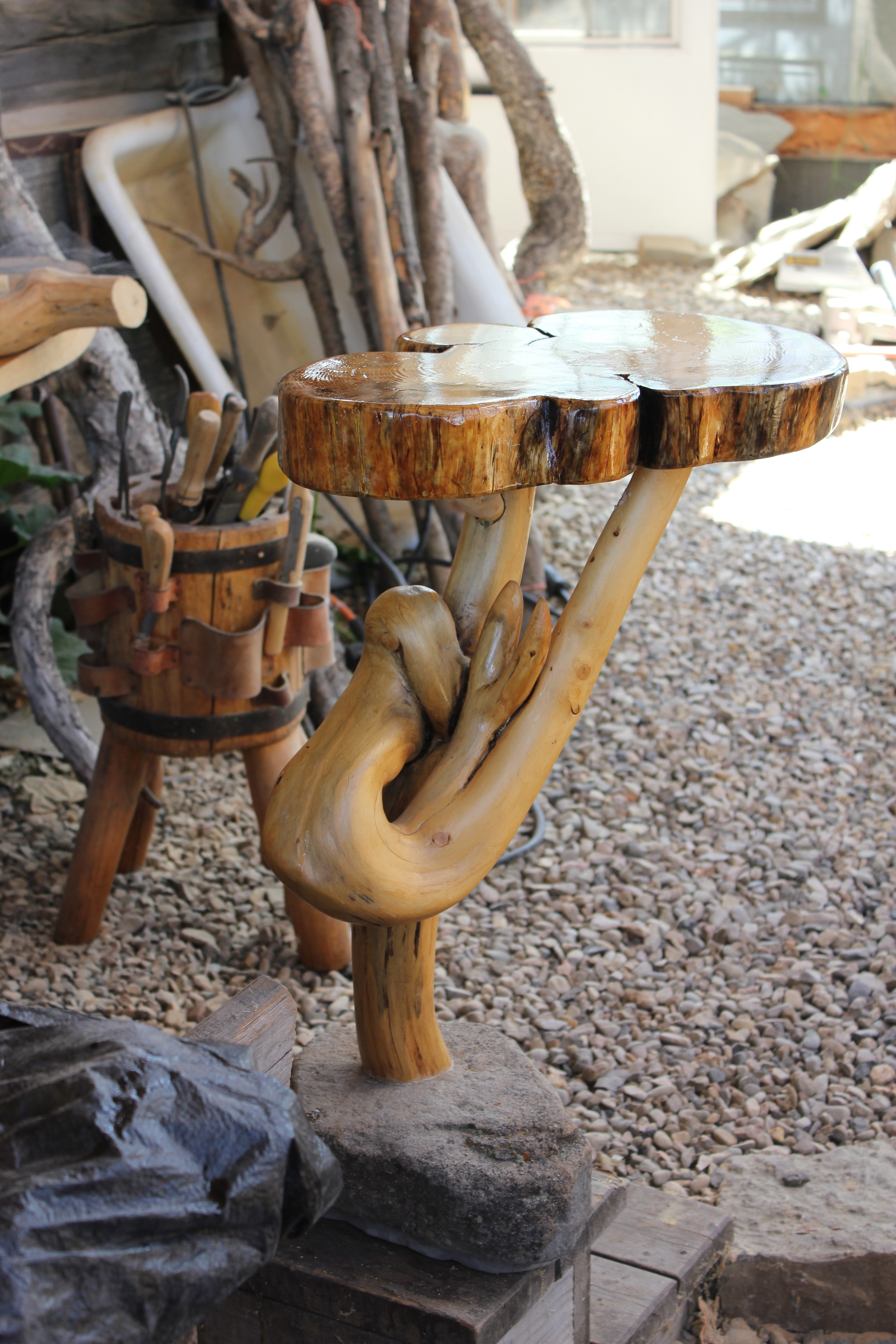 Here’s another view of the end table that better shows the contortions of the tree trunk post. Also, notice the tool caddy in the background.