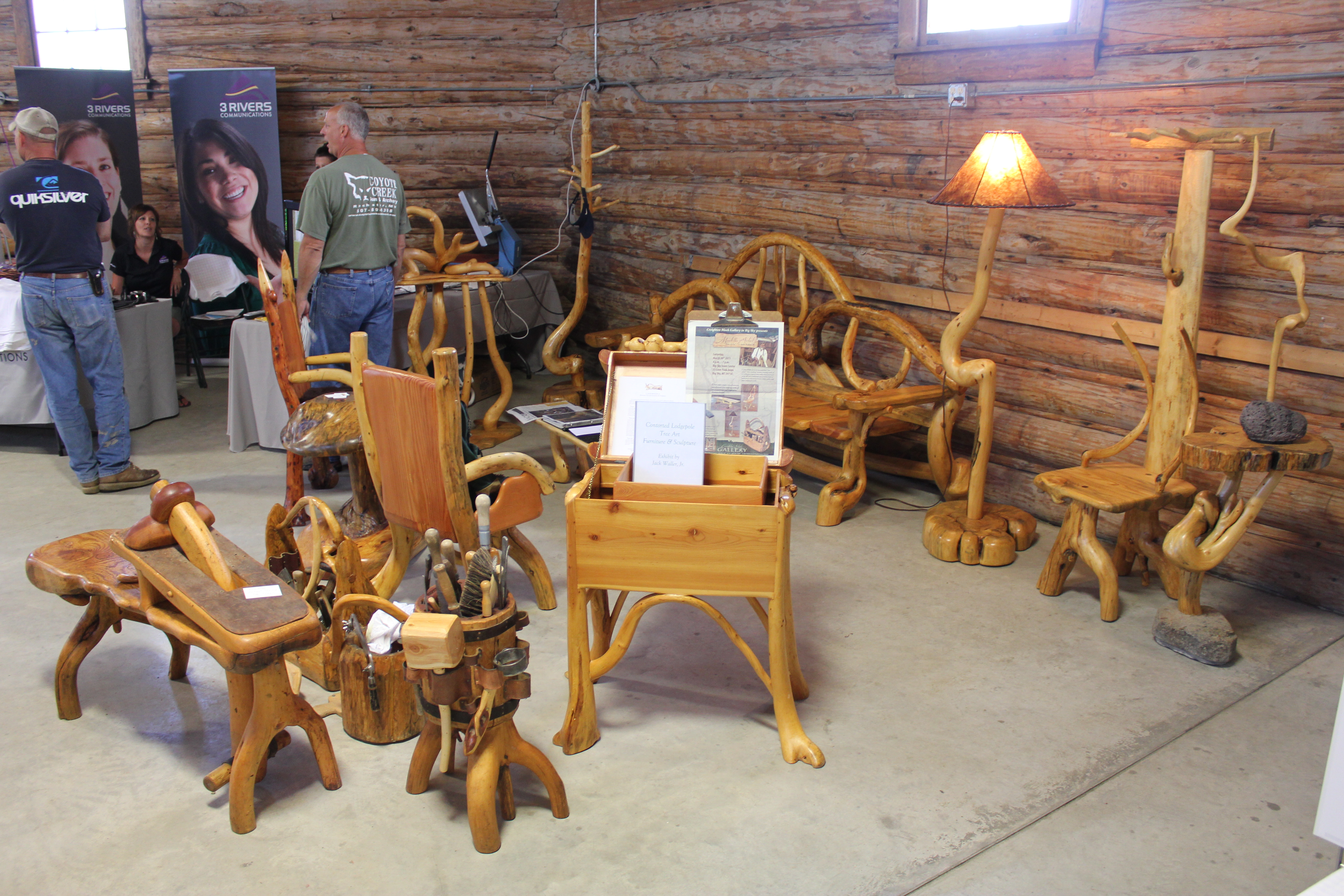 An important reason for my wanting to exhibit at the fair was/is my admiration for the octagonal log architecture of “The Pavilion.” Another reason is that our three families all live just across the Beaverhead River from the fairgrounds. Yet another reason is that the booth space was large enough to allow a collection of 11 pieces of furniture, as well as my shaving horse, tote box, and tool caddy.