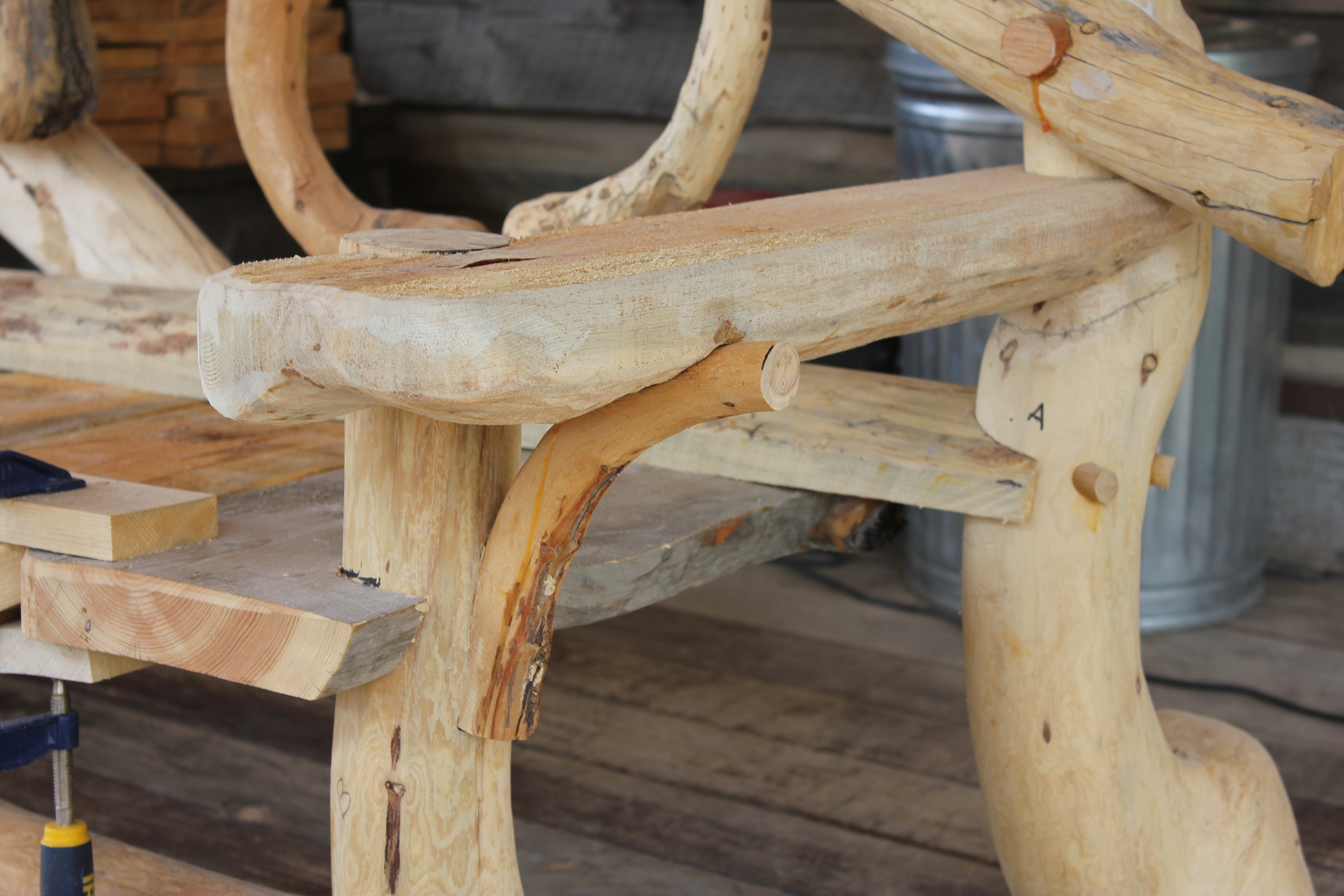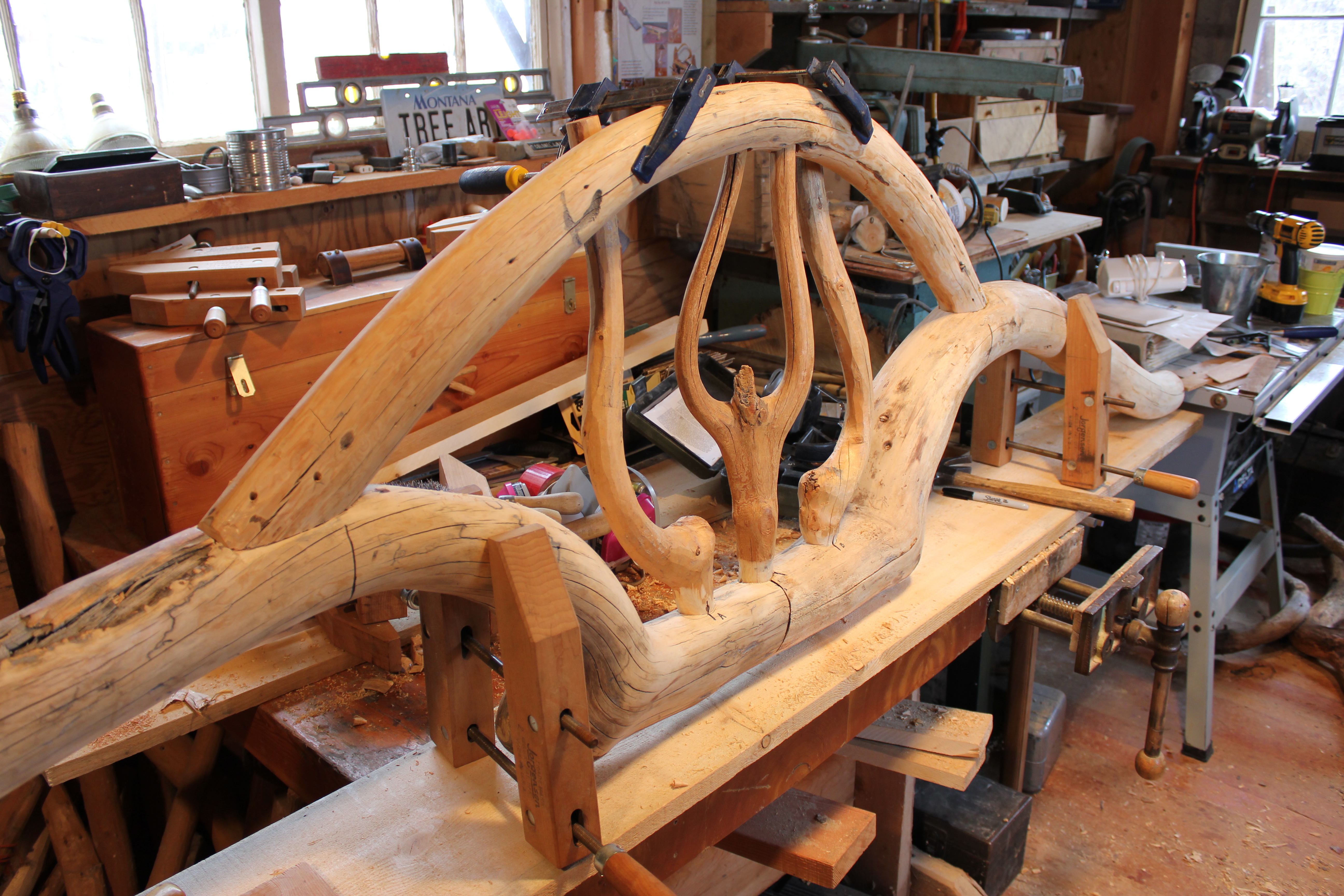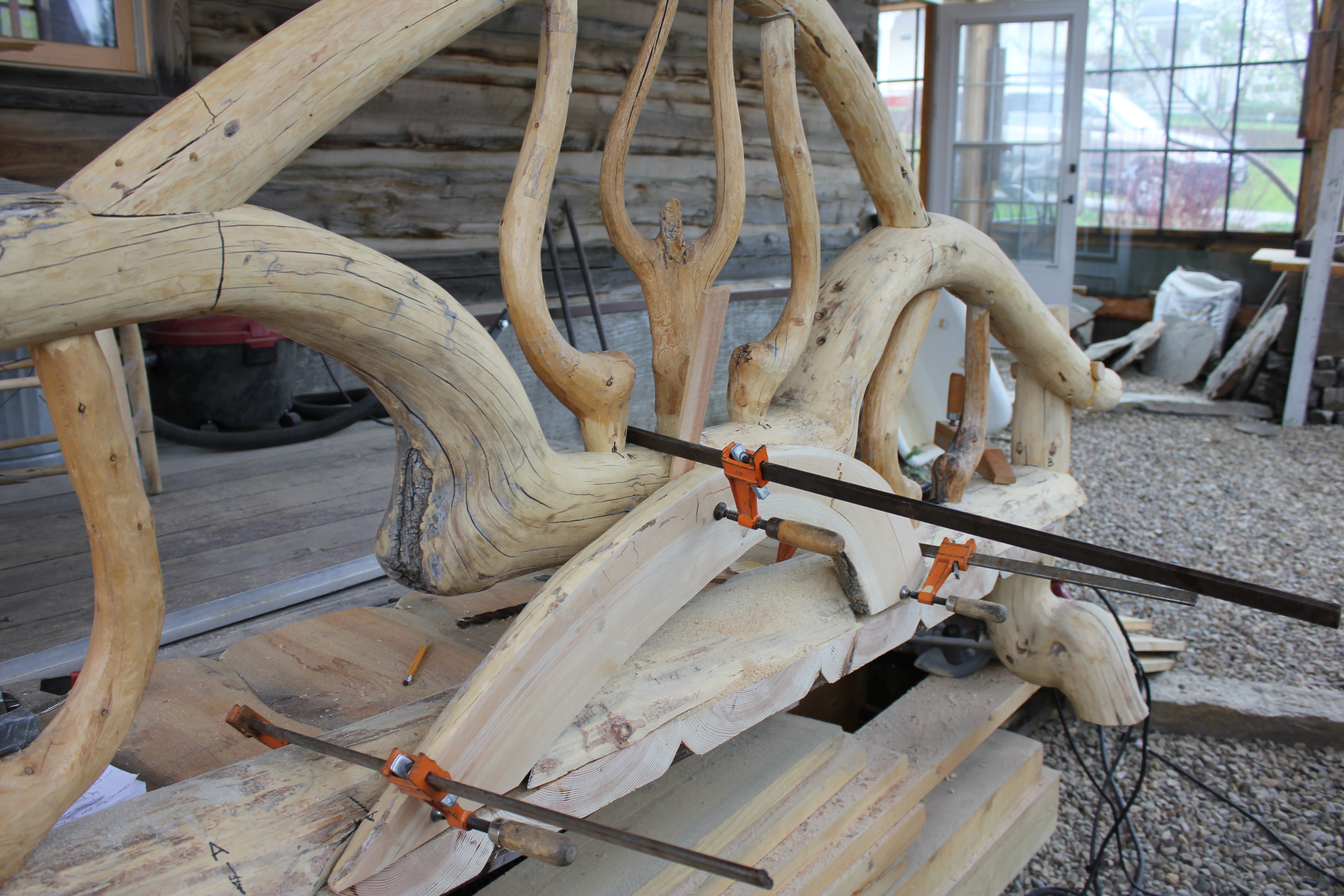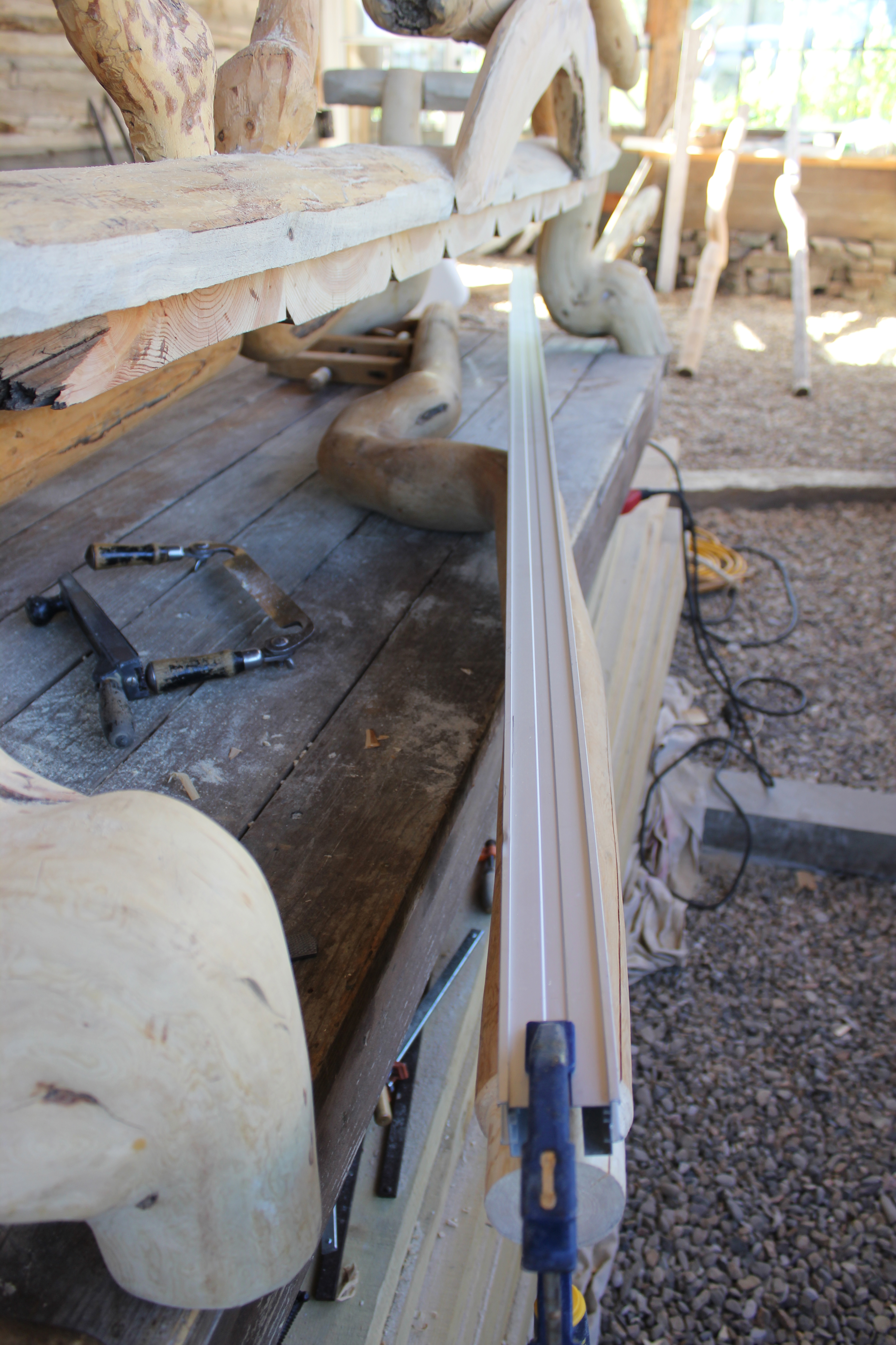 The arch is a naturally grown shape, a small lodgepole tree trunk. I flattened it with a hand adze after cutting a series of saw kerfs. The rounded side had to be inset in three places, each of which were clamped as shown here.