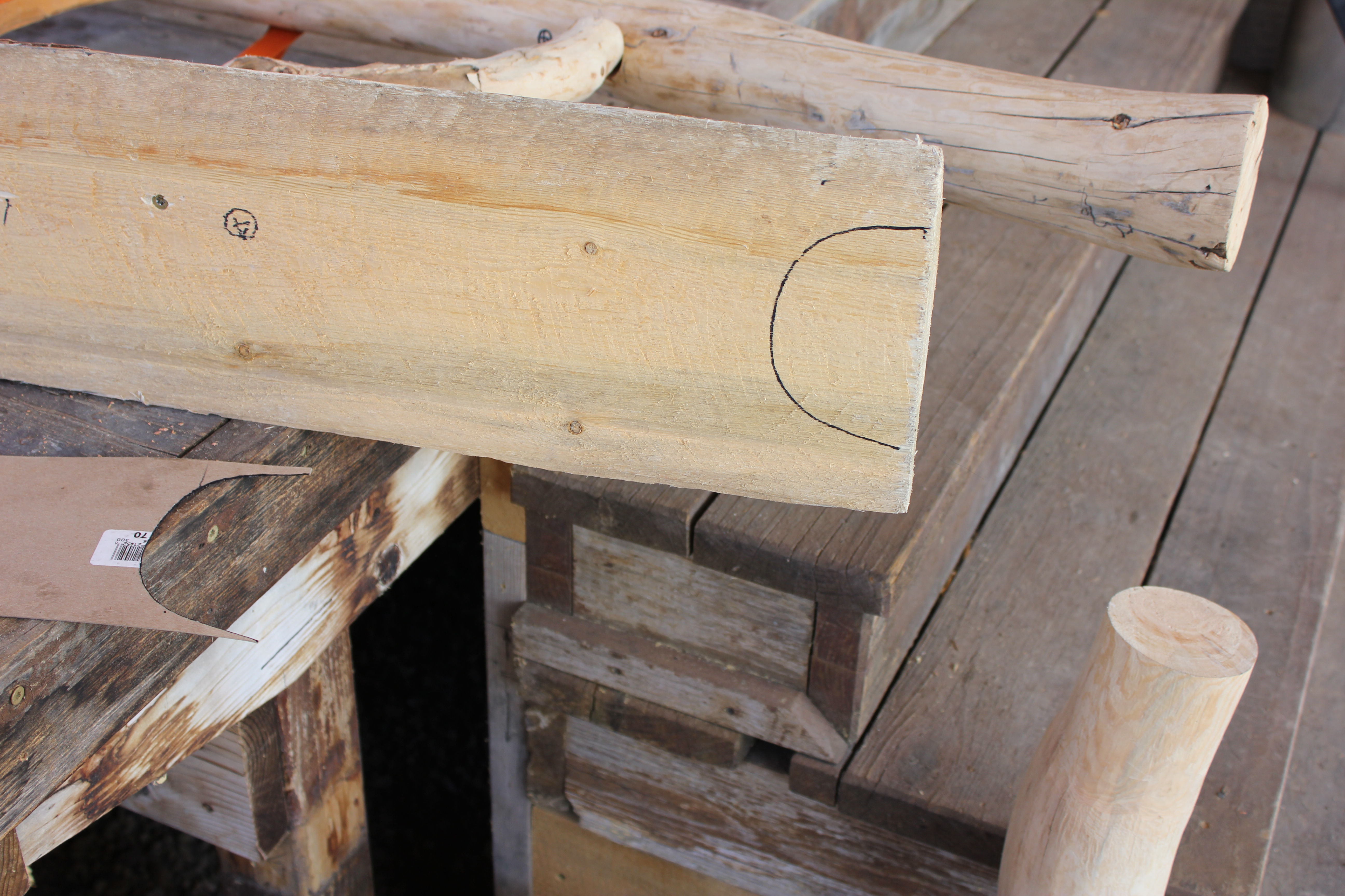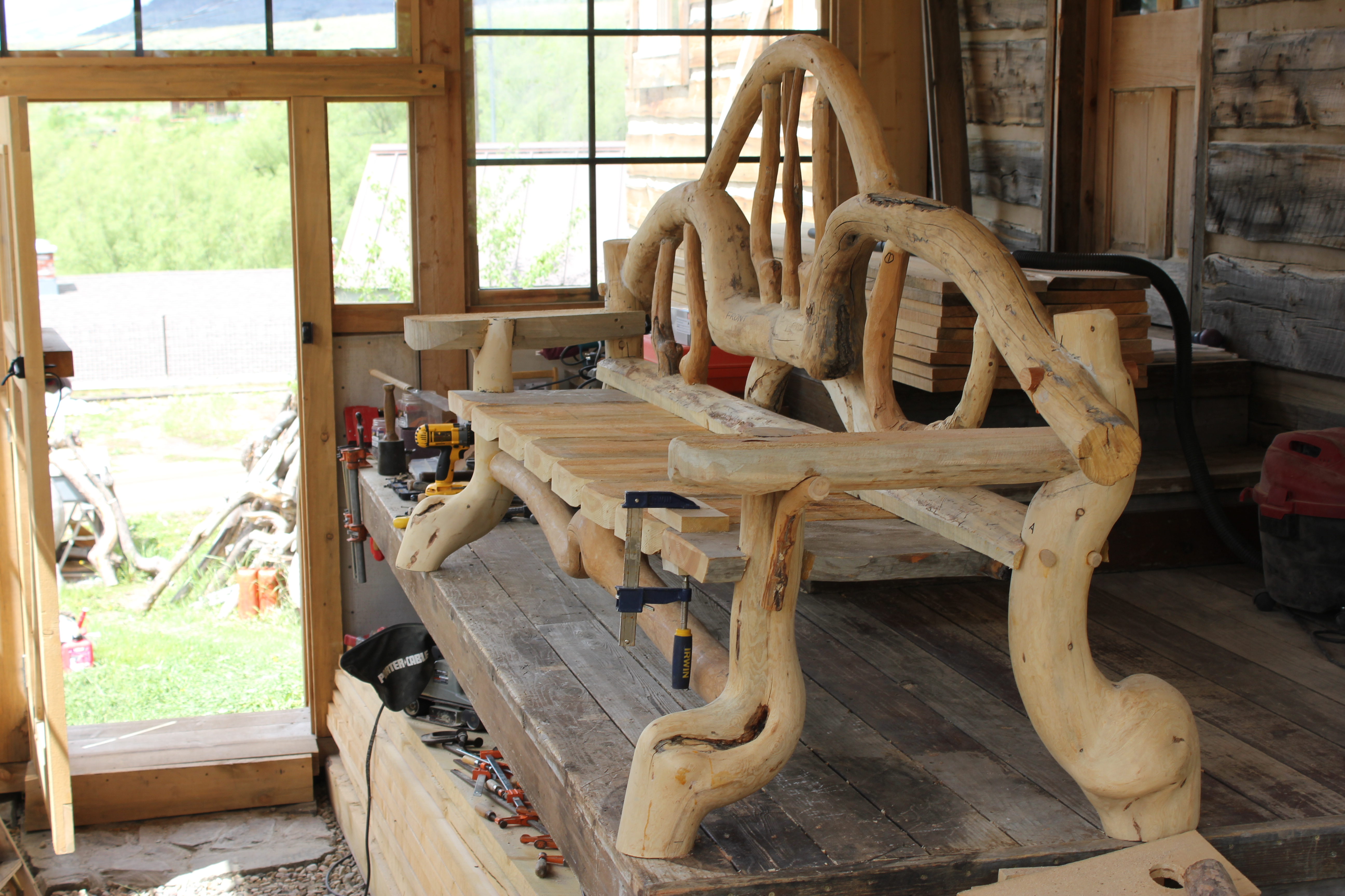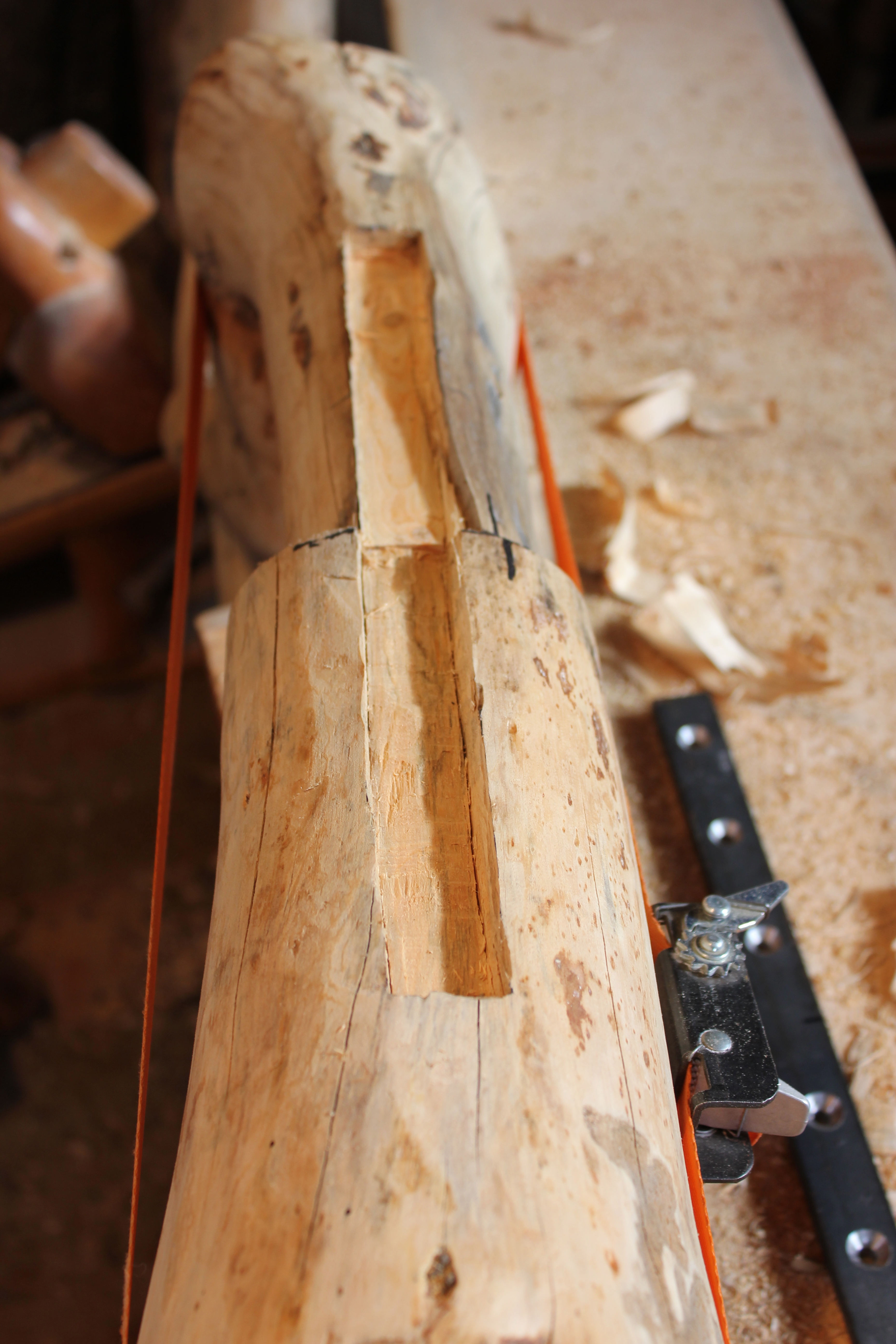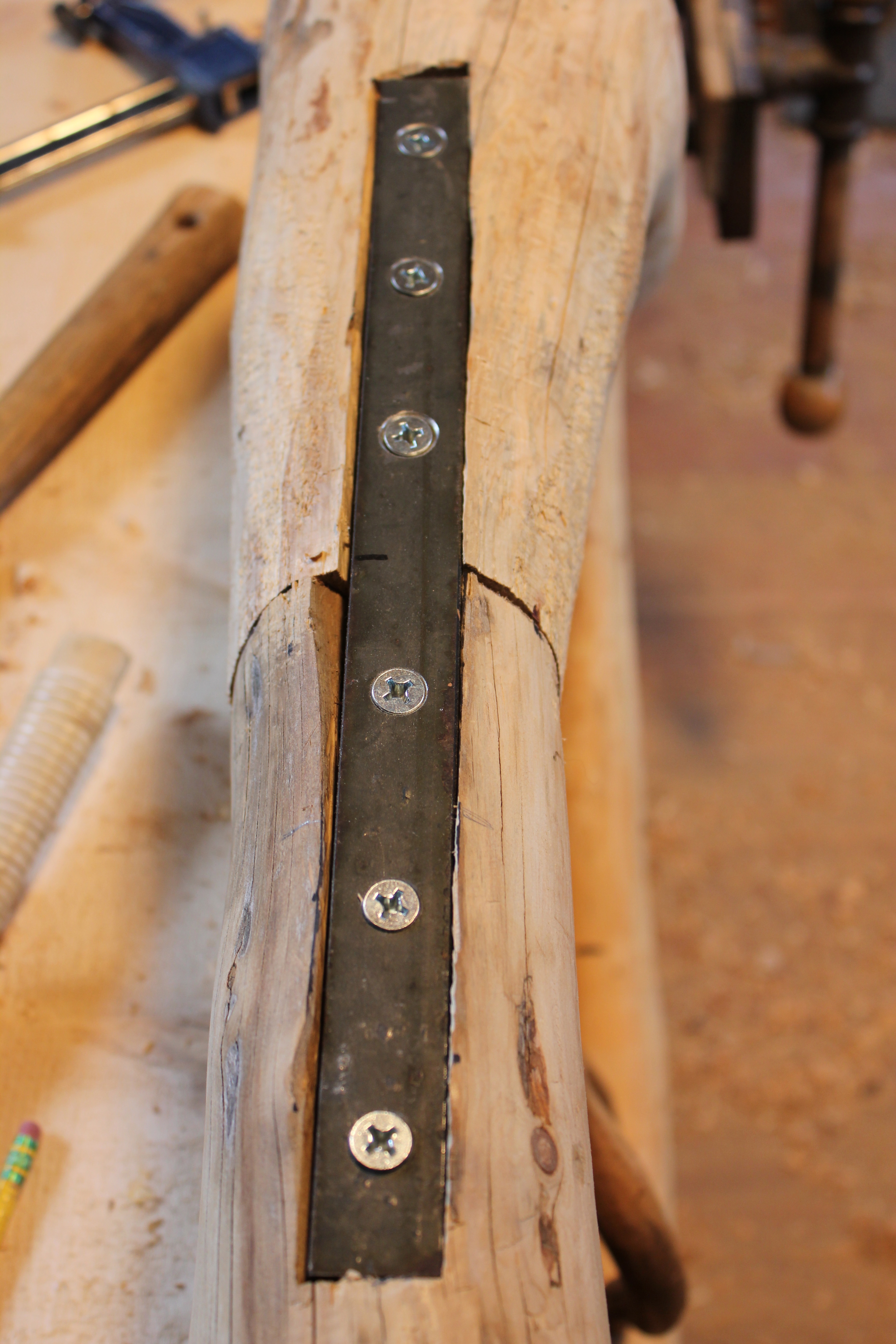 The arch is a naturally grown shape, a small lodgepole tree trunk. I flattened it with a hand adze after cutting a series of saw kerfs. The rounded side had to be inset in three places, each of which were clamped as shown here.