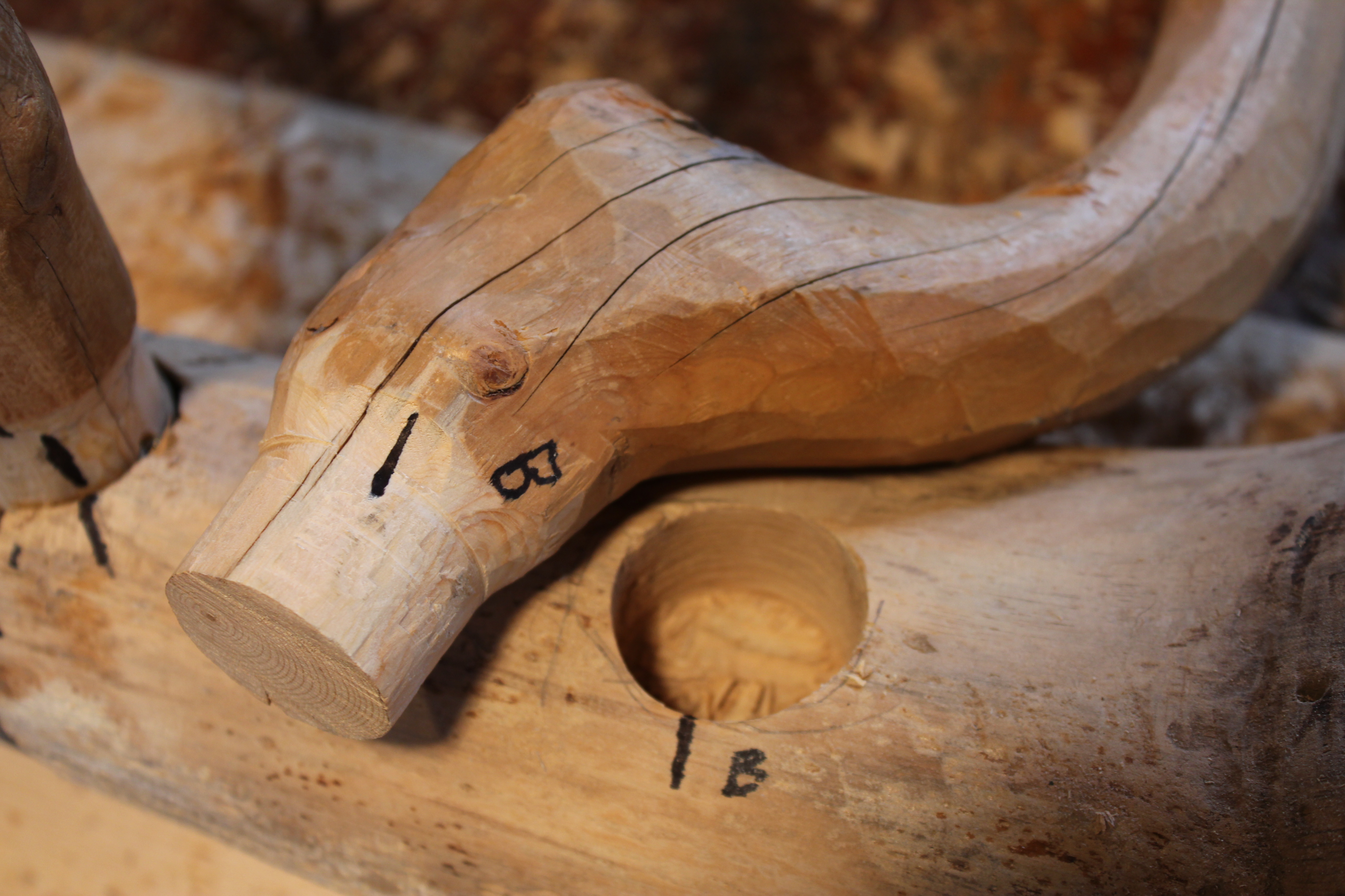 A next challenge was to place the arched tree trunk on top of the swan’s necks to make the joints. That’s a recurring challenge because hand holding and clamping the irregular shapes securely isn’t easy, but necessary to cutting and fitting the joints repeatedly.