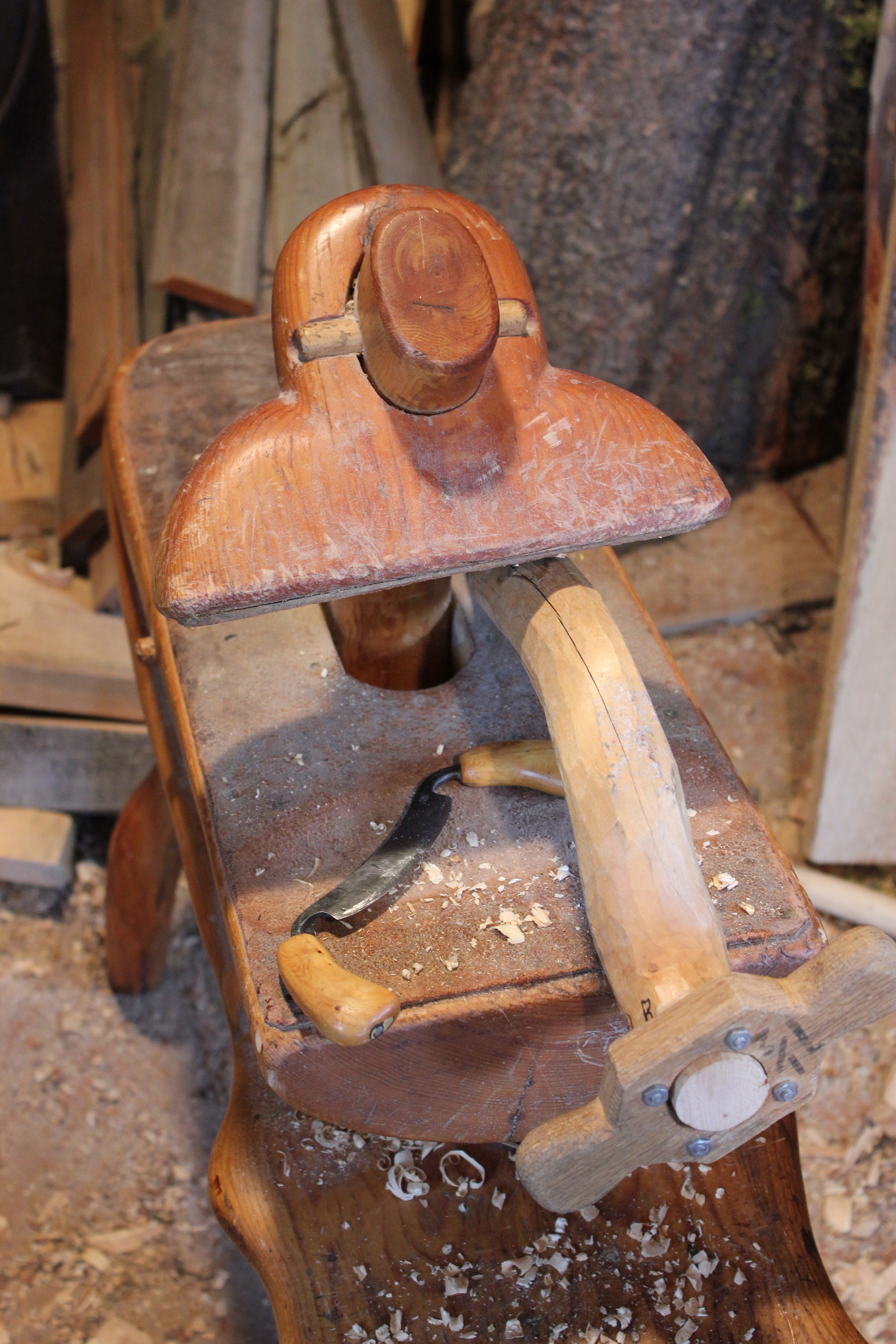 The drawknife and long arch held in the shaving horse. This is an example of the difficulties, the awkwardness of securing the irregular tree shapes, and of how helpful the shaving horse is.