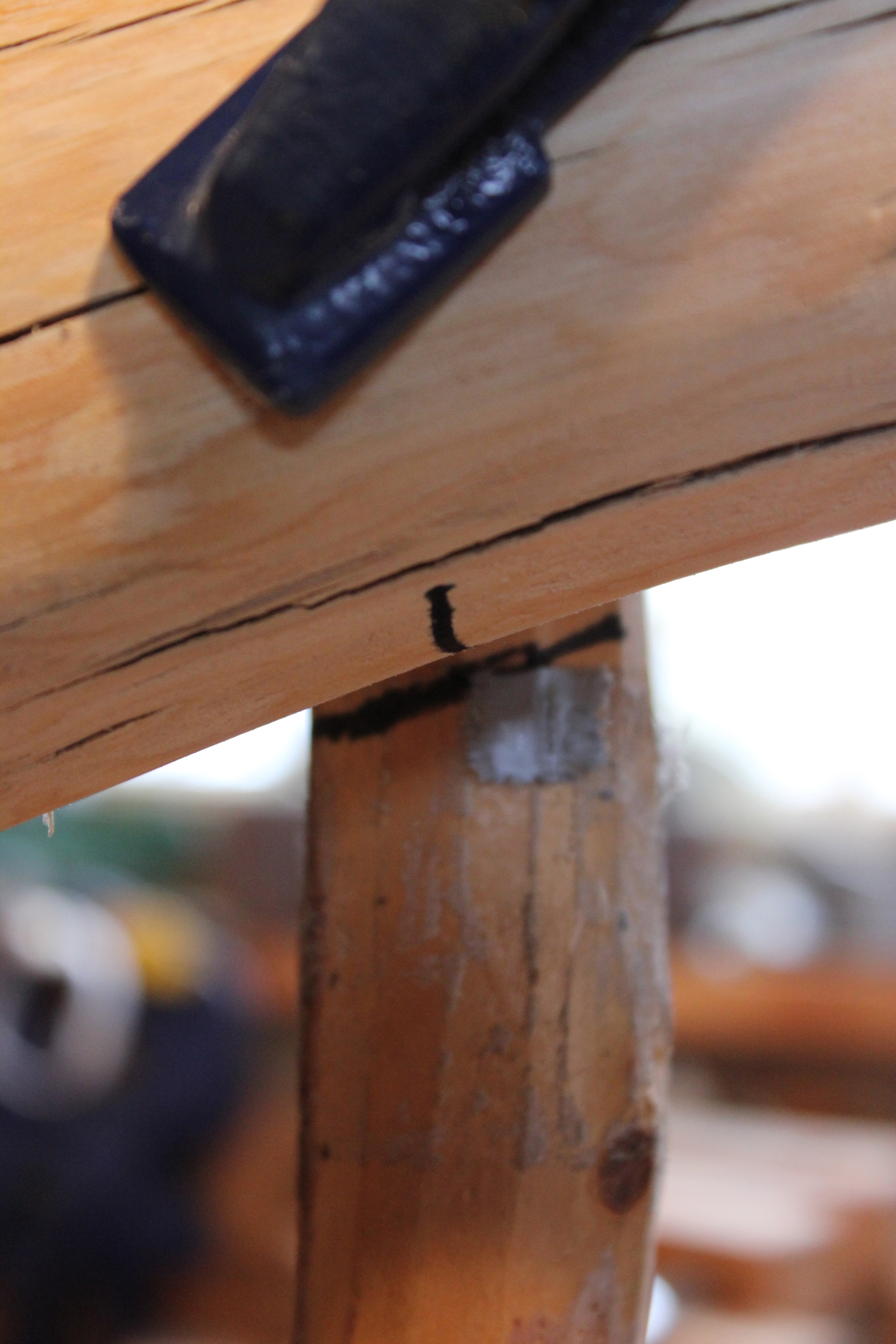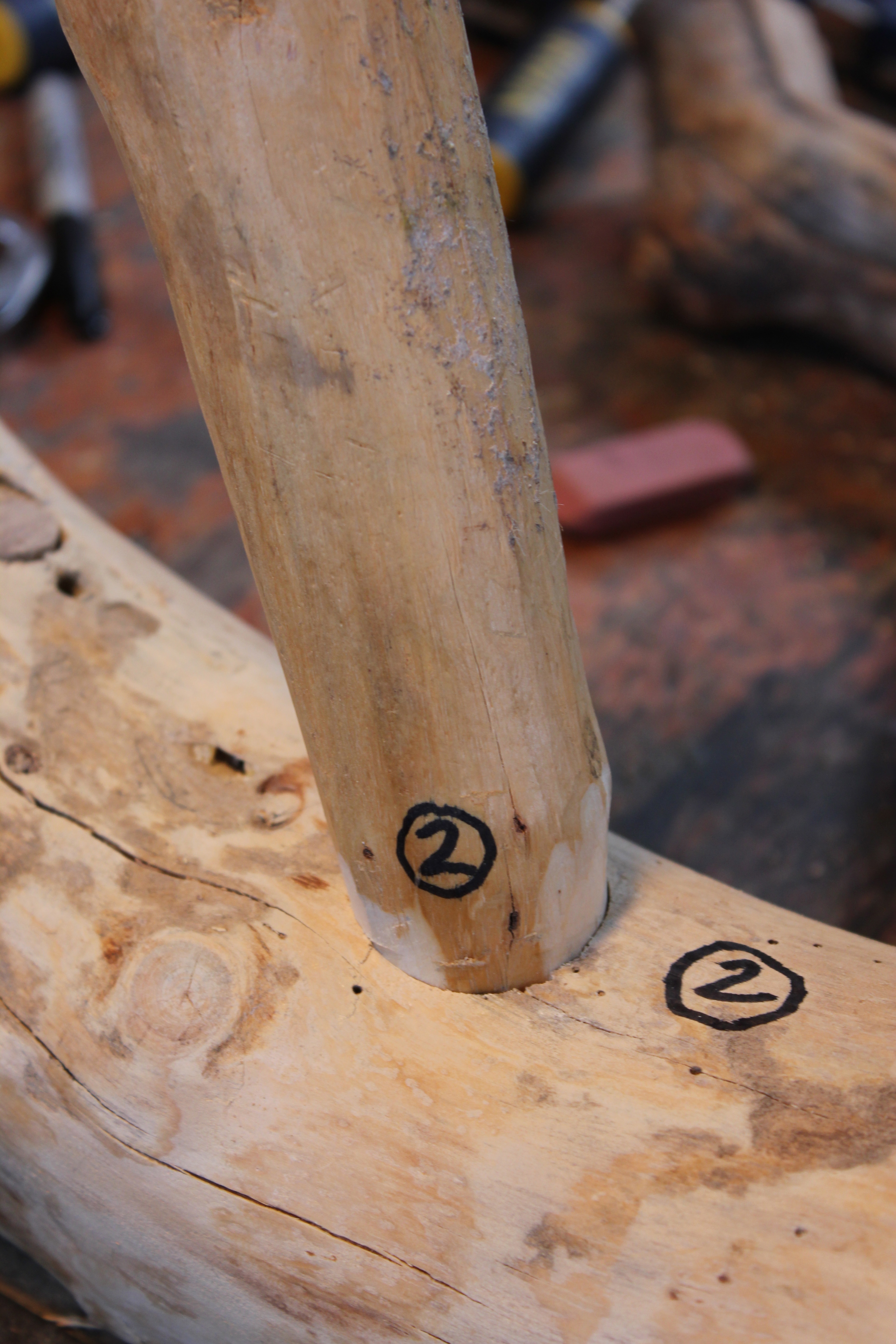The opposite end of the stretcher required a saddle notch, because of the difference in the heights of the two ends. The end of the stretcher was left in its full diameter.