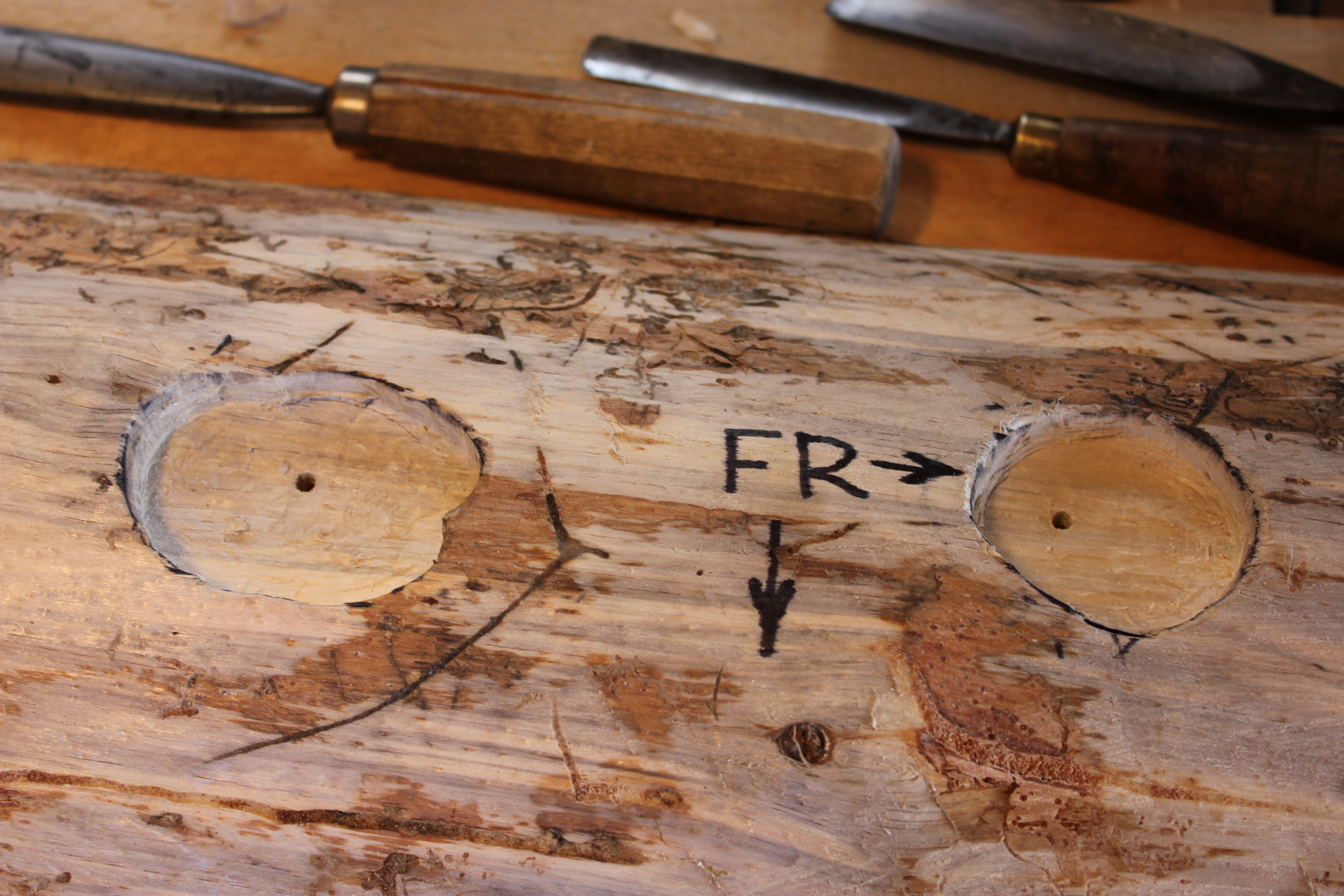 After the bark was drawknife off the slab, I scribed around the end of each swan neck for a matching mortise to secure each of them as a tenon. The FR with arrows remind me which edge of the slab is to the front and which end is to the right.