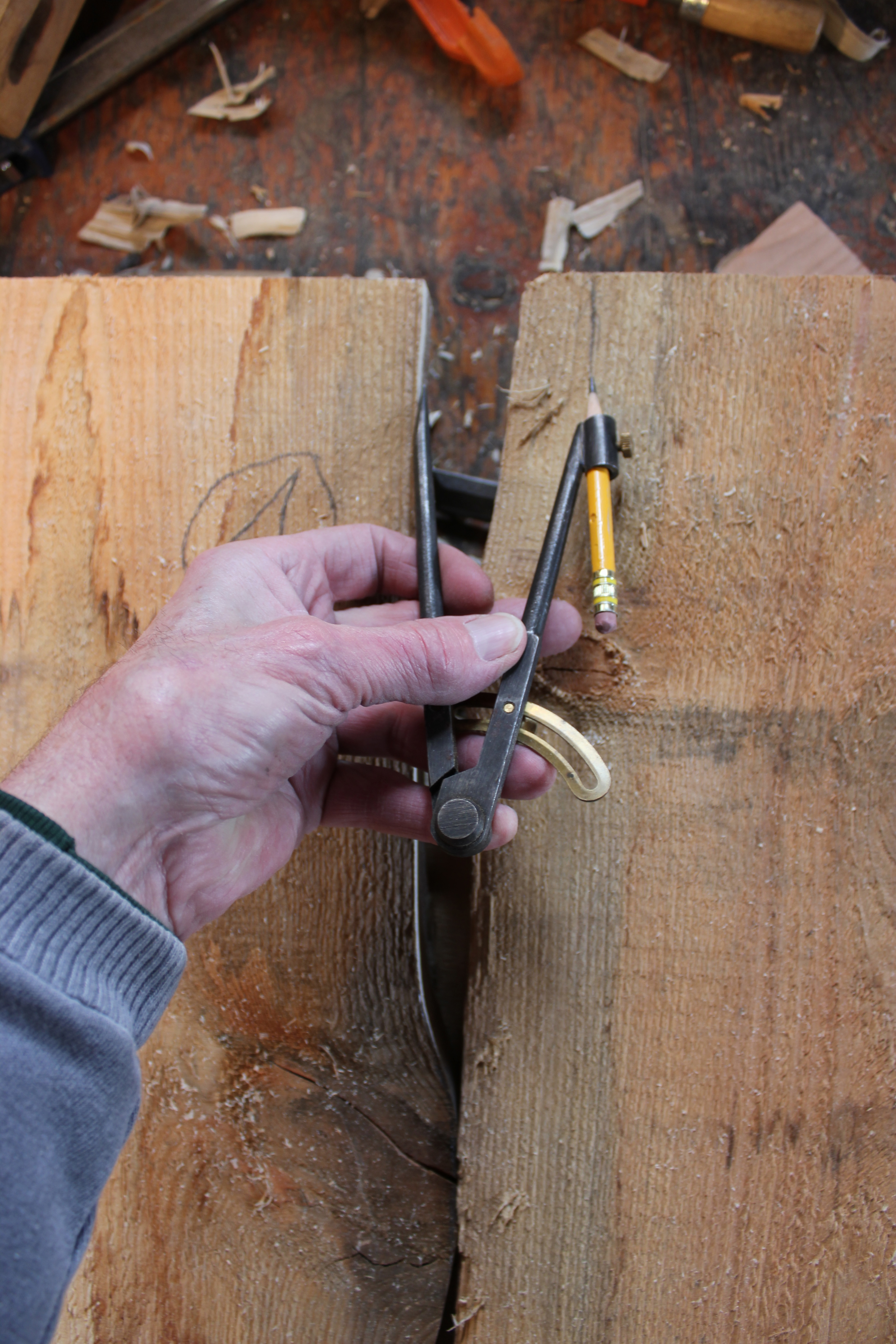 After one side of a piece has been cut on the bandsaw, the compass serves to scribe the adjoining piece, for a paired and mate cut joint. It’s important to keep the point and the pencil directly opposite to each other, closely perpendicular to the direction of the joint.