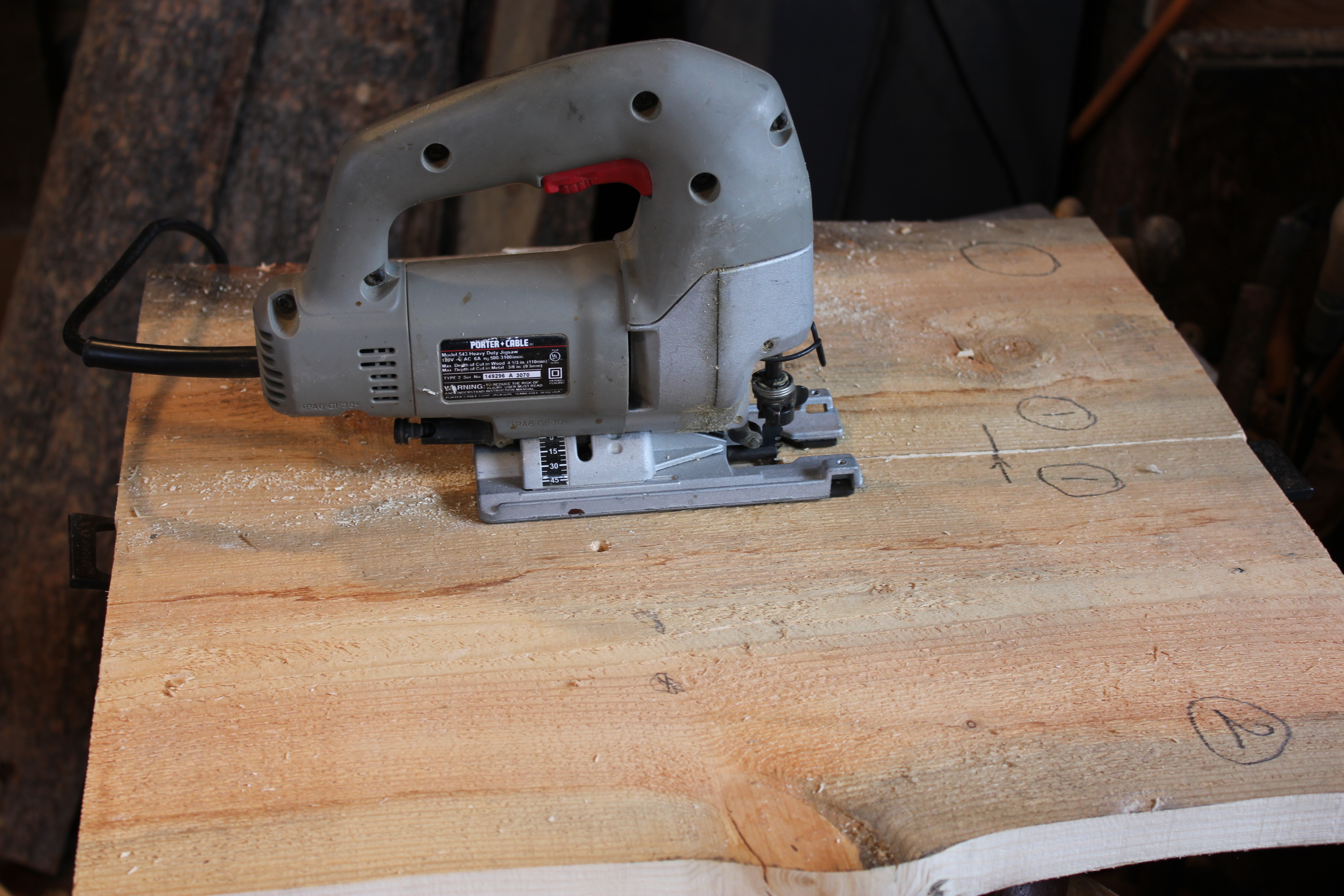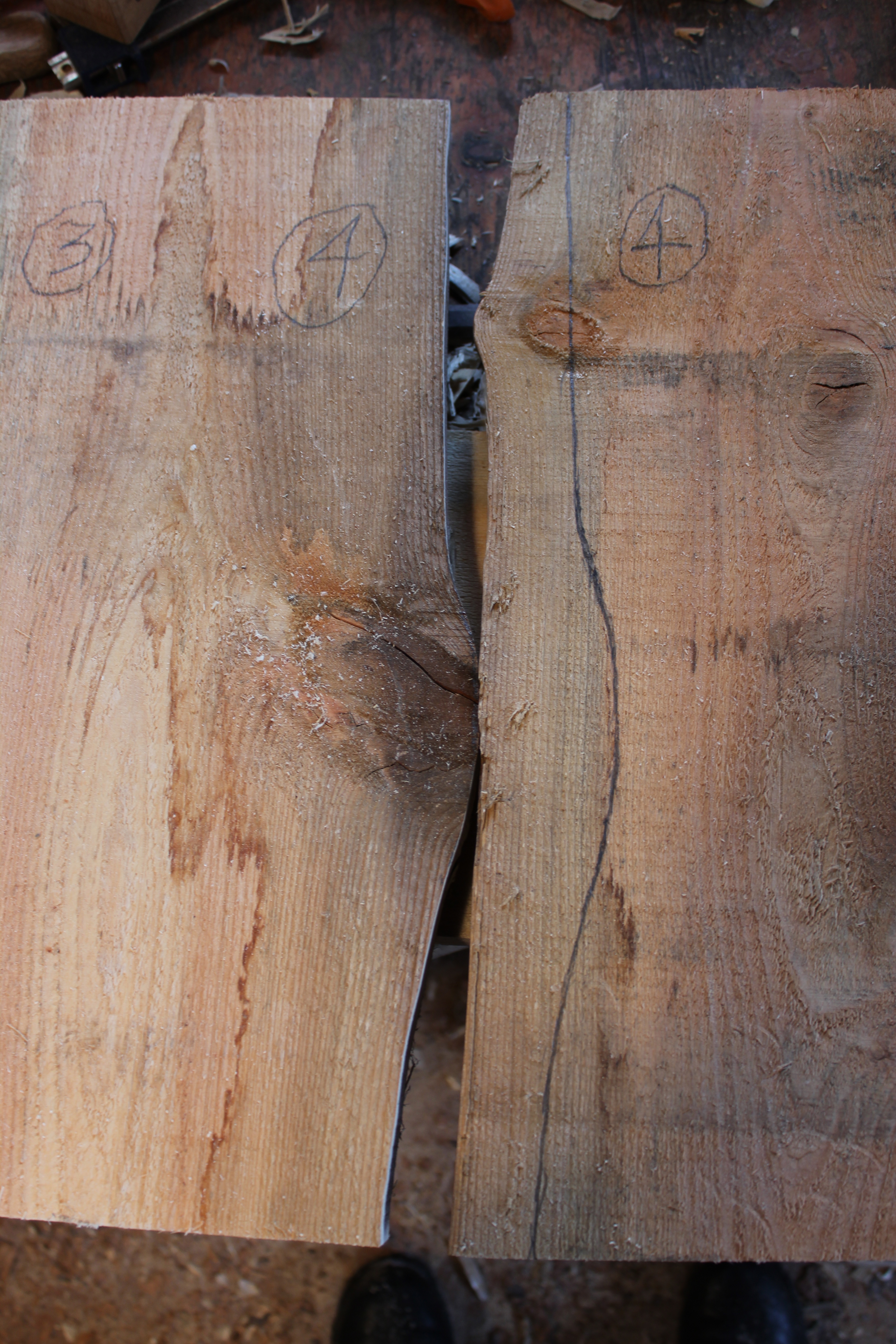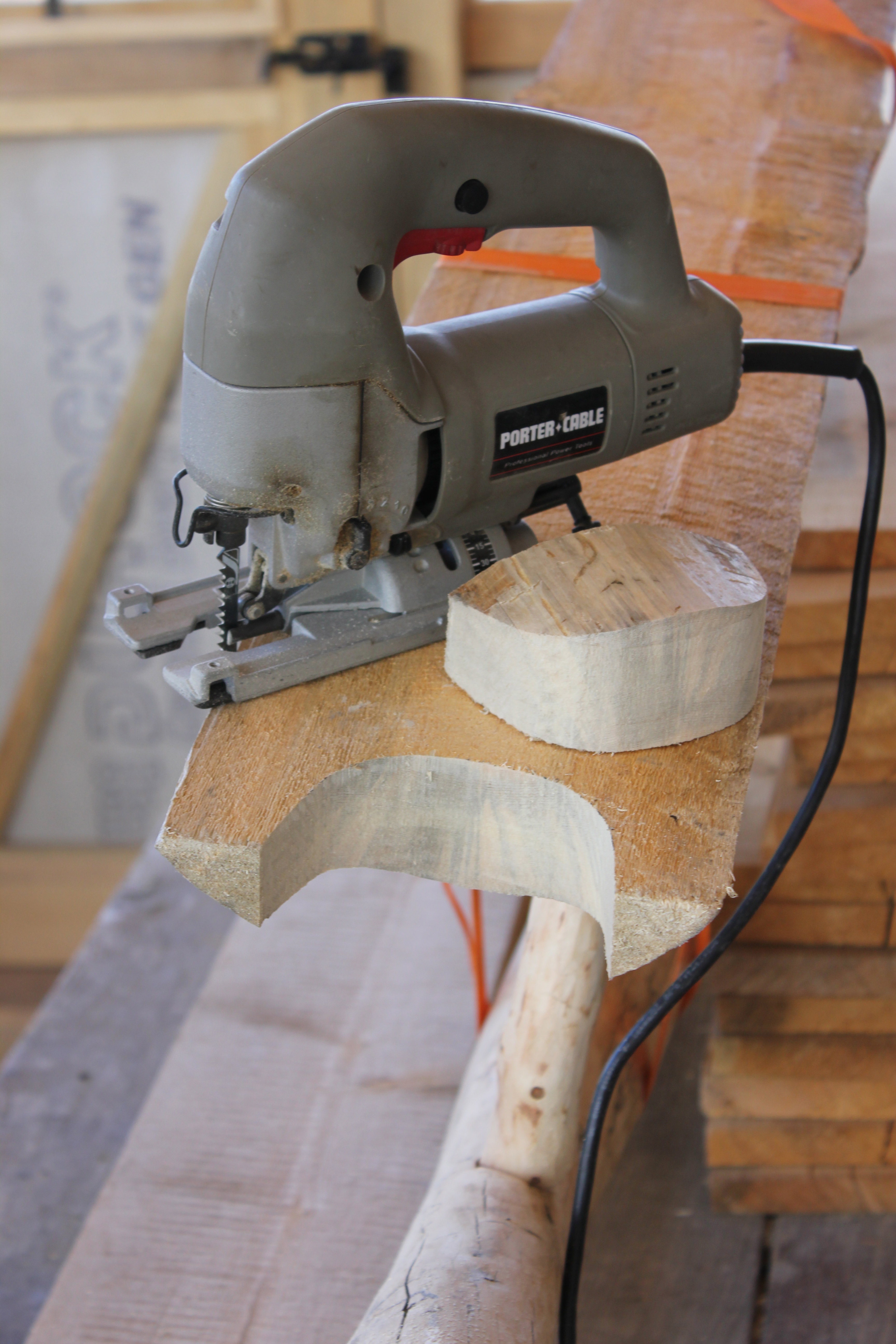 The edges of these pieces have all been cut on the bandsaw. Now, one joint at a time, after each end of the paired pieces has a log dog driven in, the jigsaw will mate cut the final butt joint.