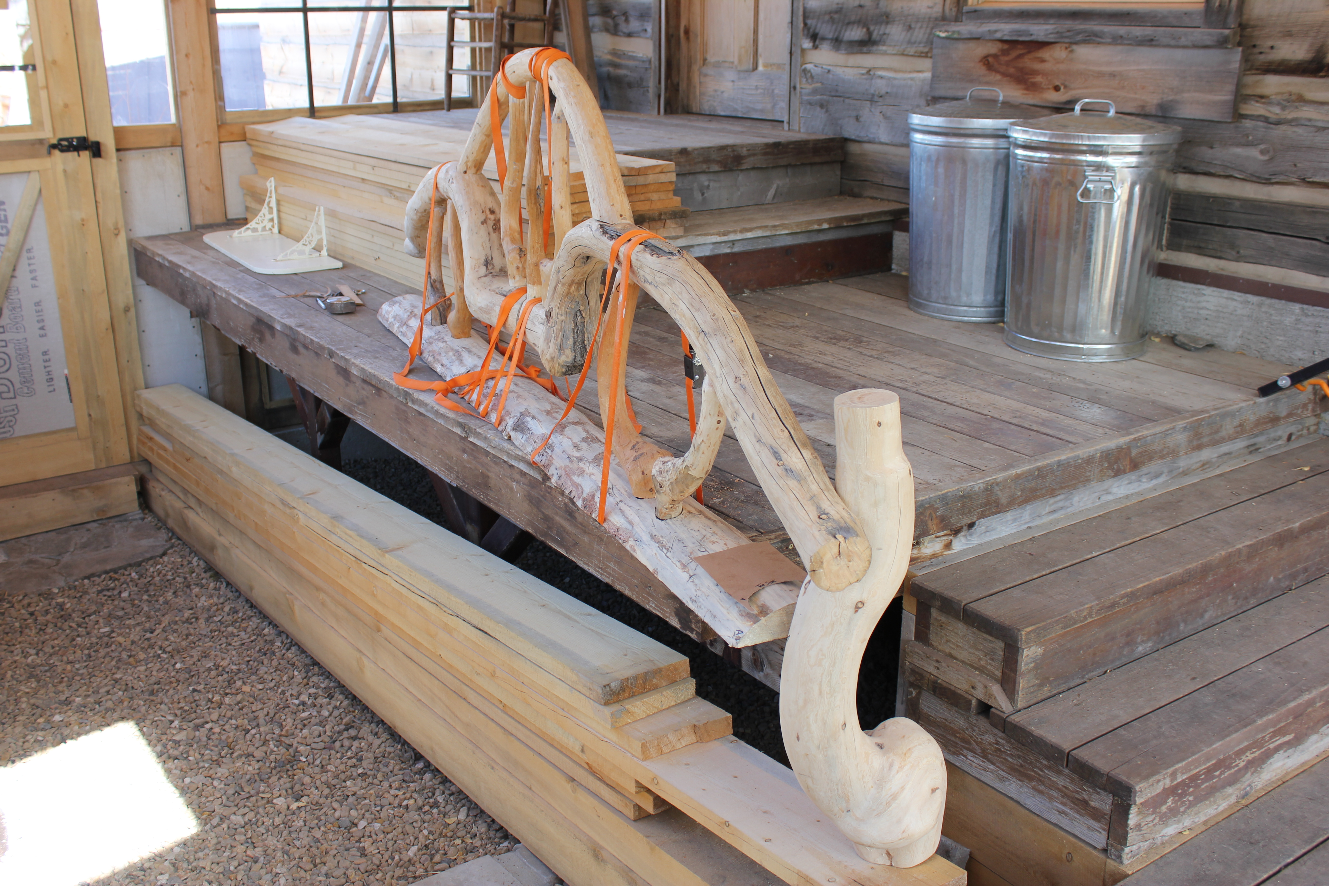 This view is from the back (north) end of the greenhouse, showing the repeated “motifs” of the posts (swan neck) and of the lower rails (loop around). The stacks of contorted lodgepole pine tree trunks in the background provided the inventory to select the handrail components.