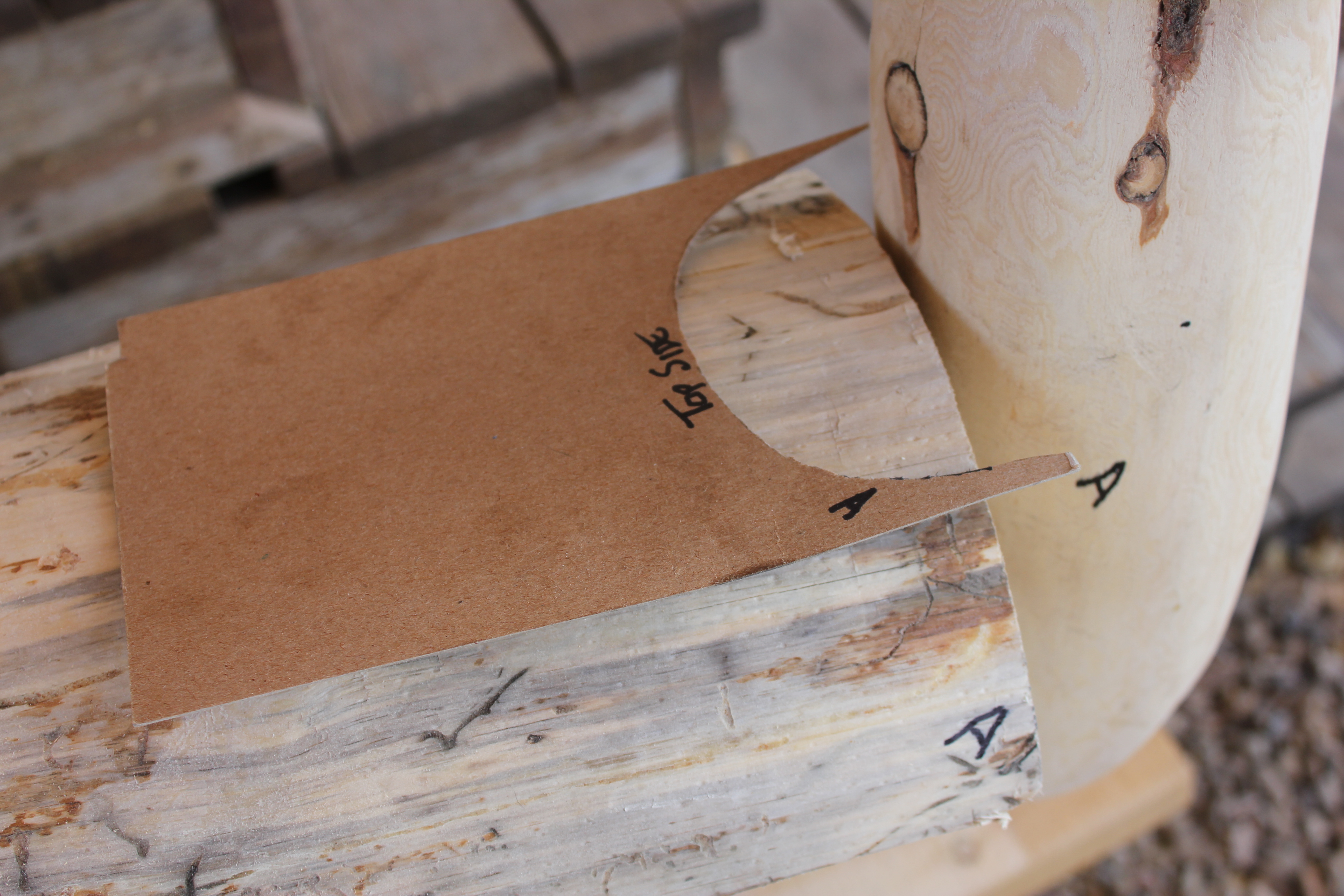 Using a piece of light cardboard, I’m starting to make a pattern for the coped cut out on the bottom of the back rest, the first of the two to receive the leg.
