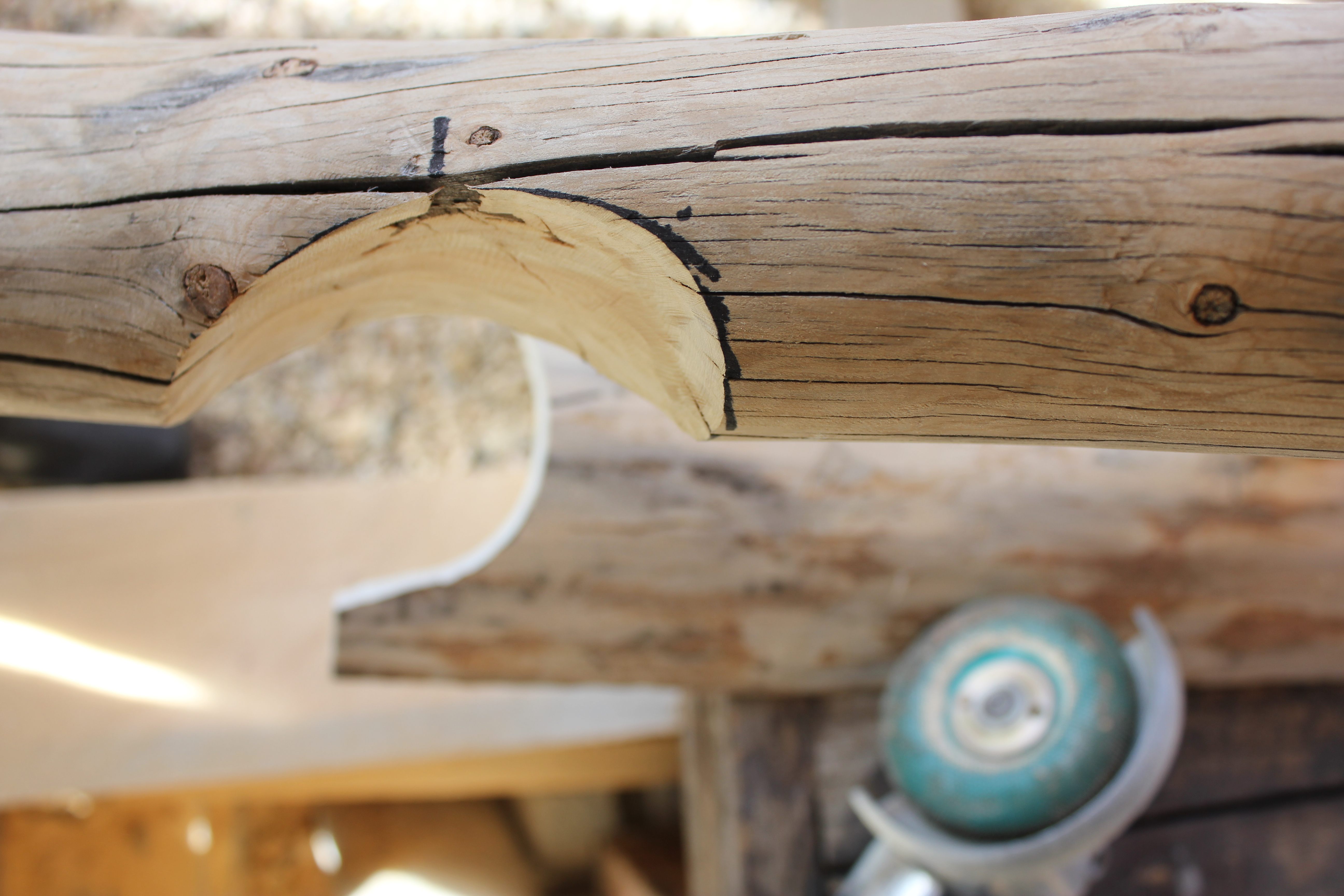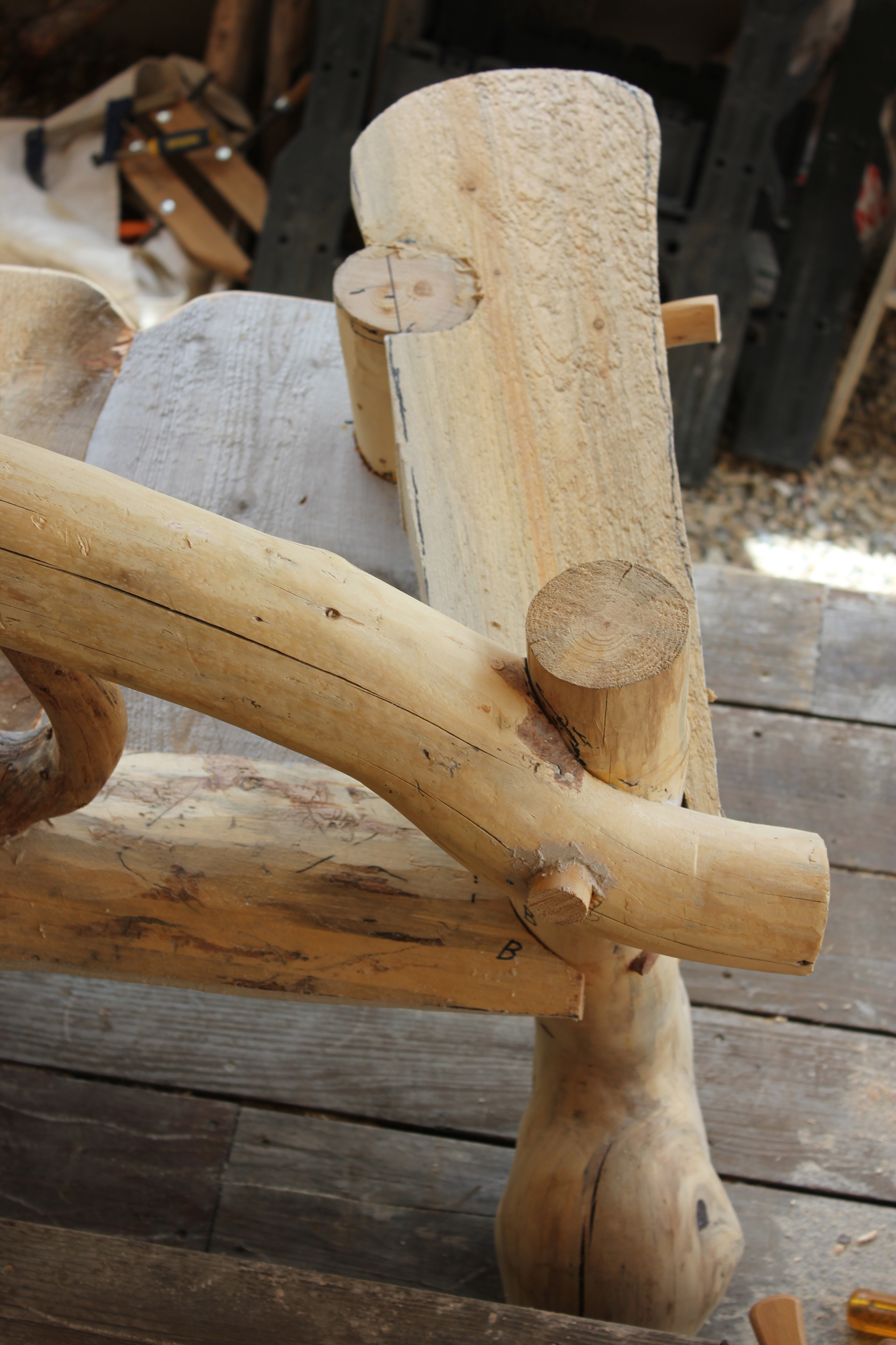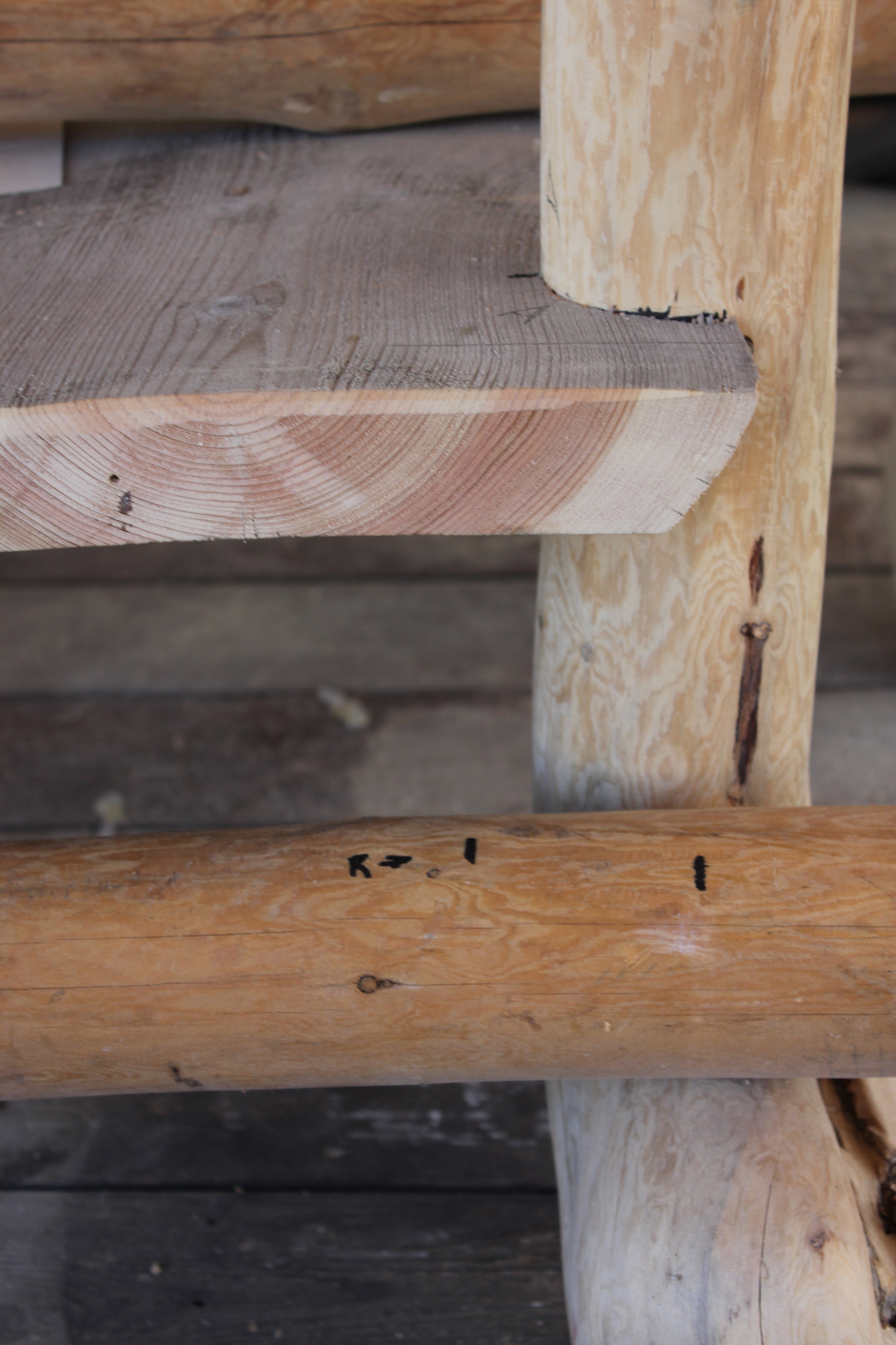 I used the following five types of joinery: cylindrical mortise and tenon; post and socket; mate-cut butt joint; scribed notch; and half-lap. Each of the joints were reinforced with log screws.