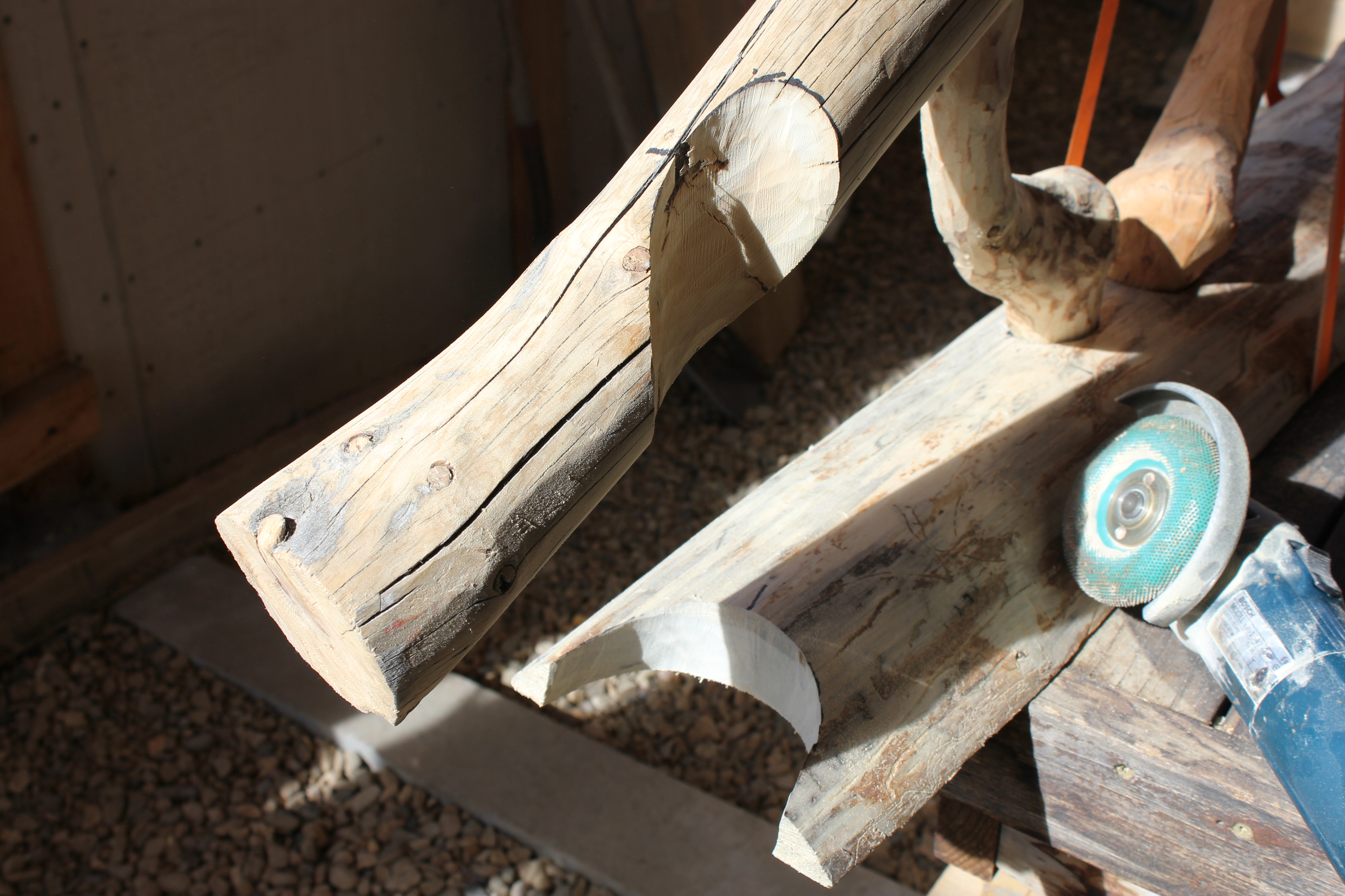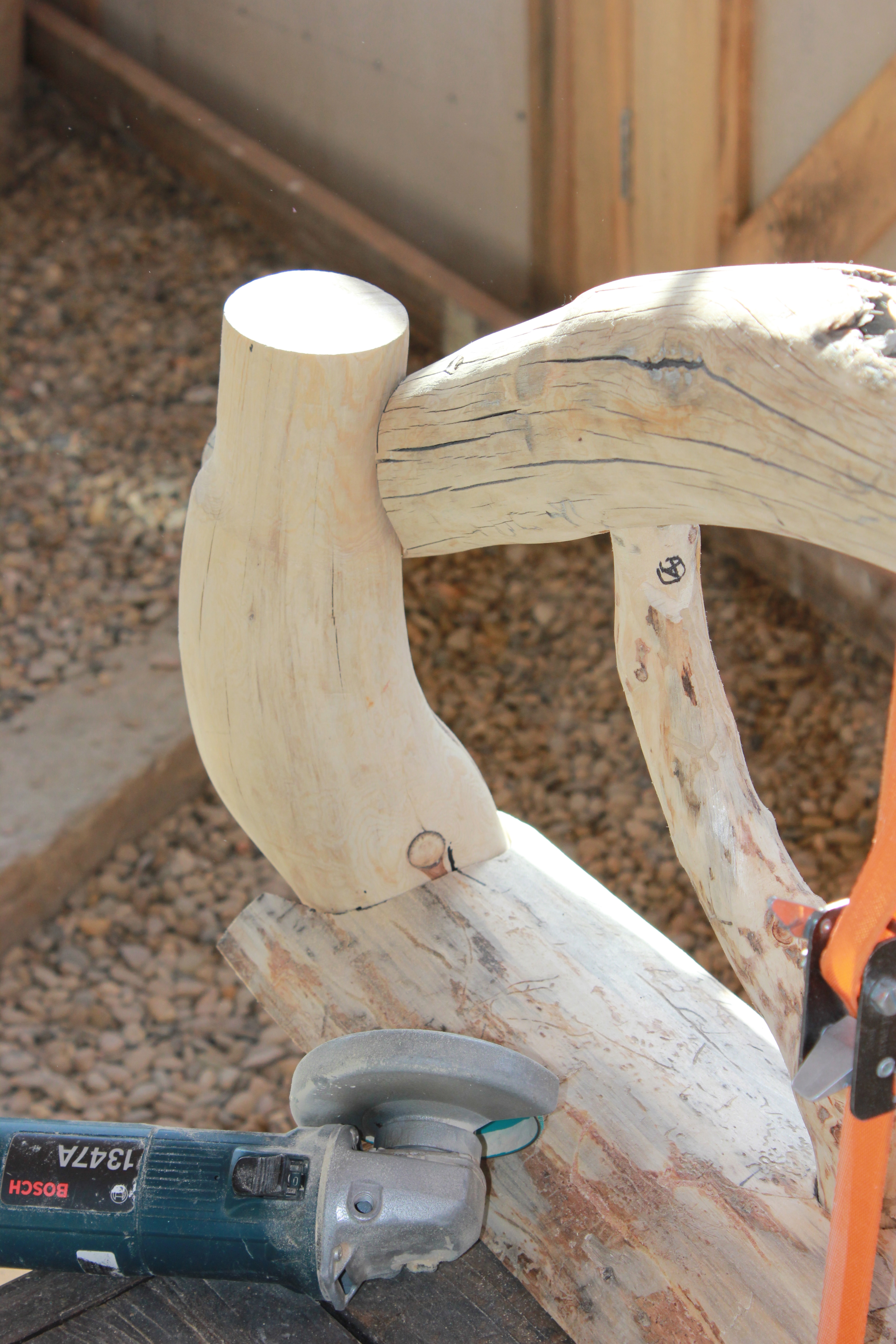 With all of the components now in place, I’ve started the tedious and time-consuming processes of cosmetic detailing. This is strictly a matter of appearances, mostly by removing tiny areas of remaining bark or cambium; removing excessive glue, and tool marks left by coarse grinding, rasping, chiseling, sanding; filling counter-sunk screw holes and less-than-perfect joineries; shaping/sculpting joints so they flow together; and chamfering/rounding all edges.