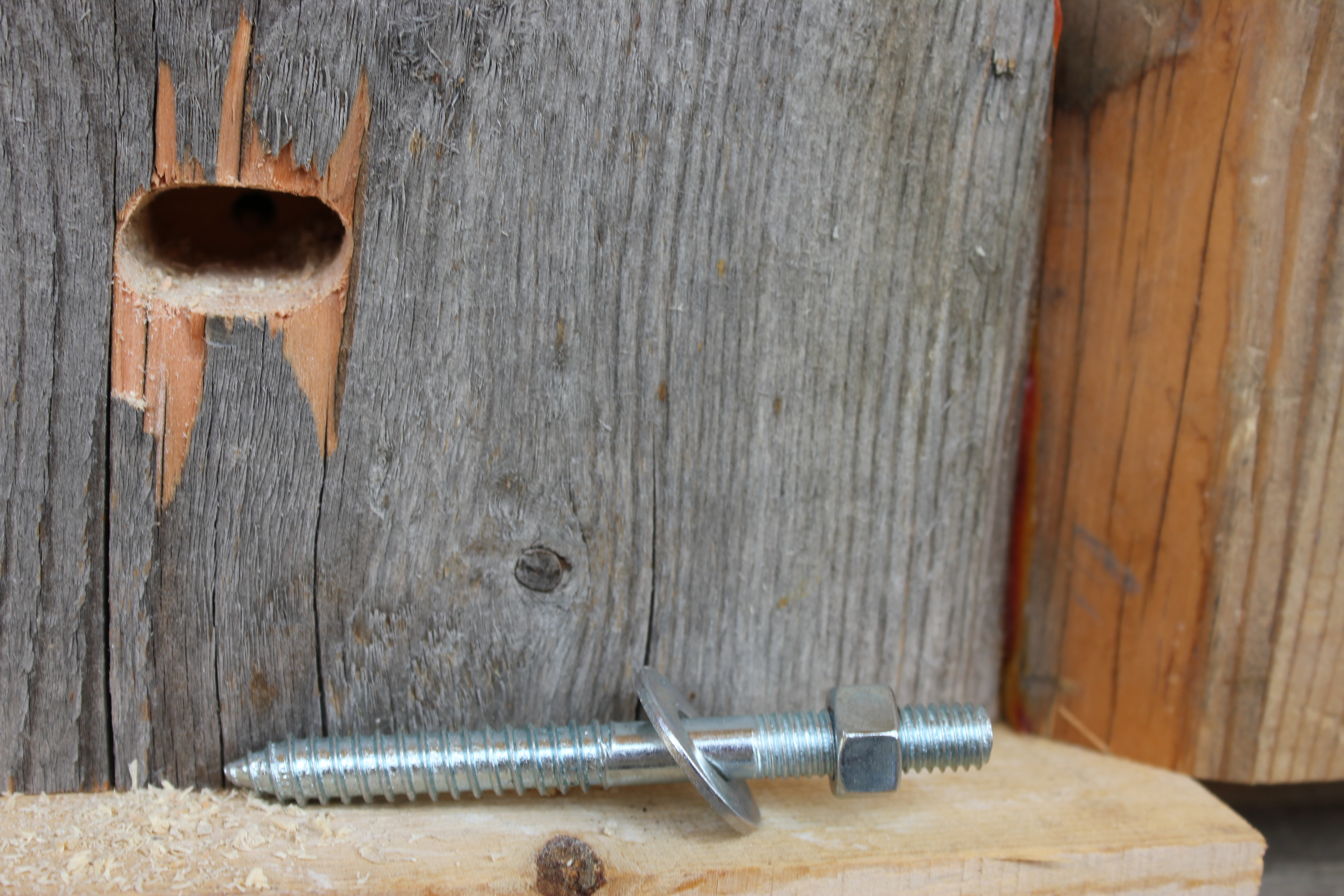 A close up of a slotted hole, this one and one at the other end of the row, are for hanger bolts to make assembly and reassembly easier. The remaining holes are for lag screws. (The drilling tear-out will be removed later with sanding.)