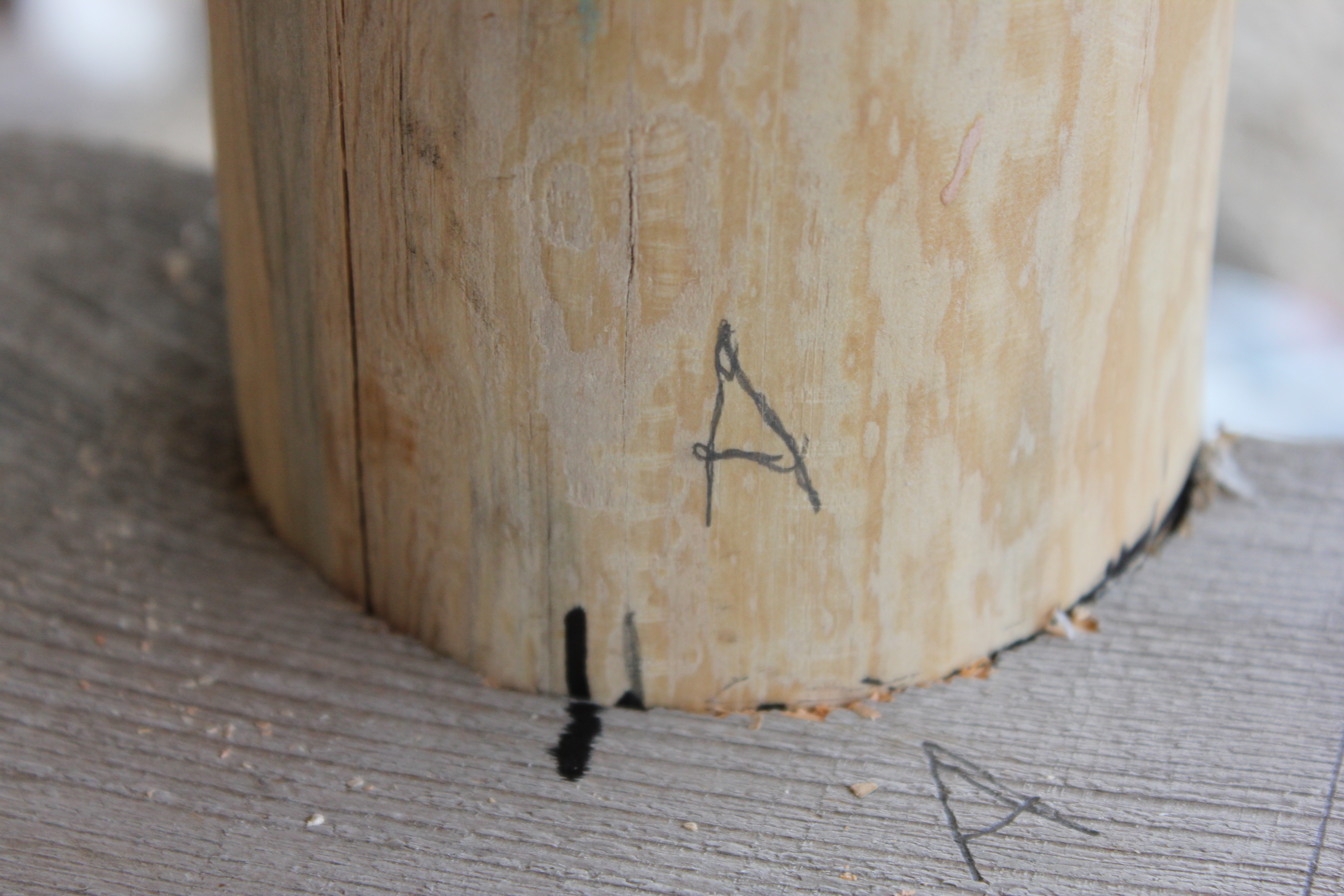 This round mortise is on the underside. Also visible is the dowel that goes up into the end of the arch on top. I always use numbers, letters, arrows, etc. for replacement after repeated fittings.