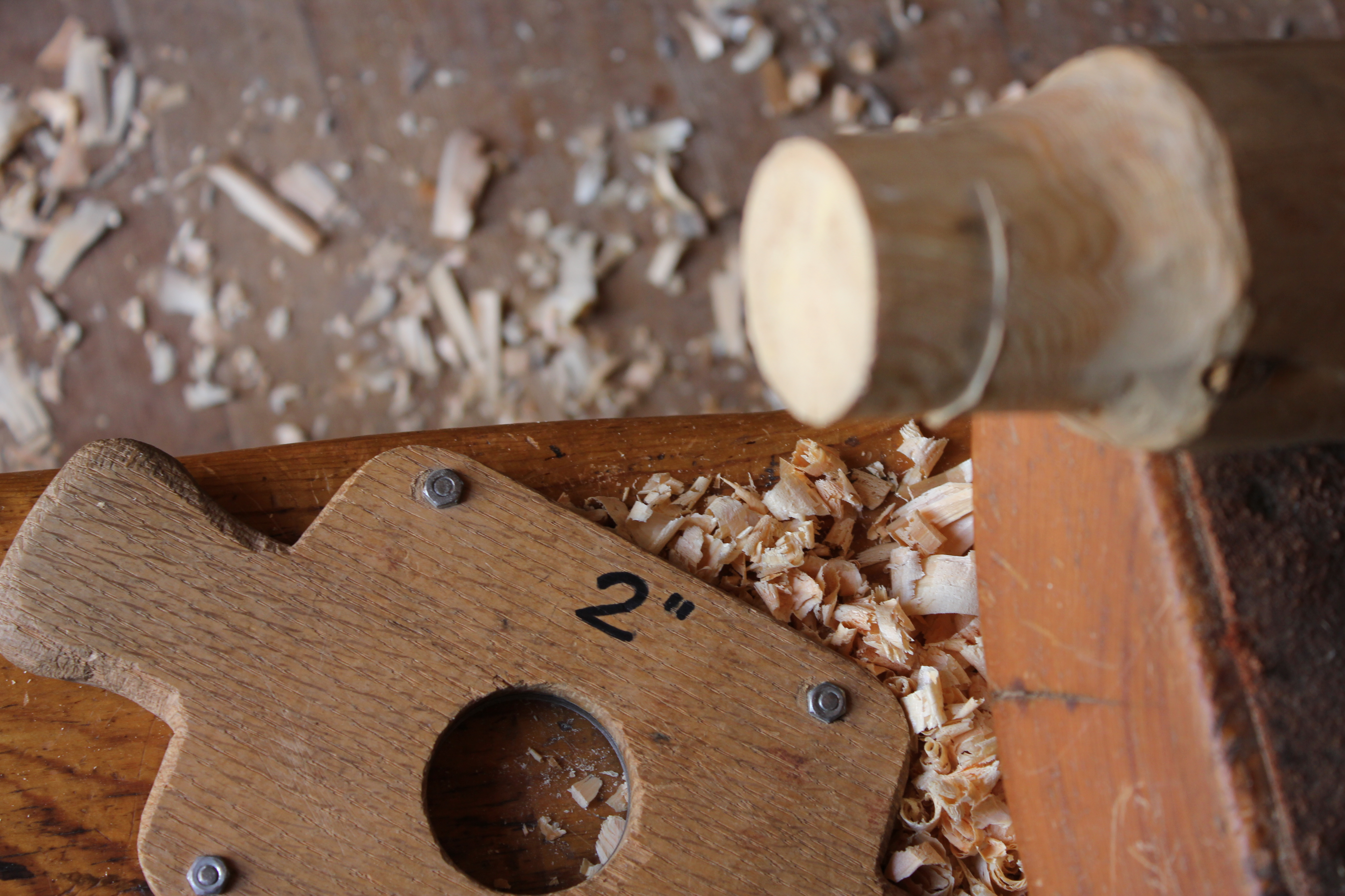 It’s tricky to get the right horizontal alignment on the drilling angle of the mortises. Because the ox-bow stretcher is not straight, the heights of the holes and the drilling angles have to matched to each end the ox-bow and to its overall shape. One mortise is 2′ in diameter; the other is 2 1/2″. I drilled them using a combination of a Forstner bit and a hole cutter.