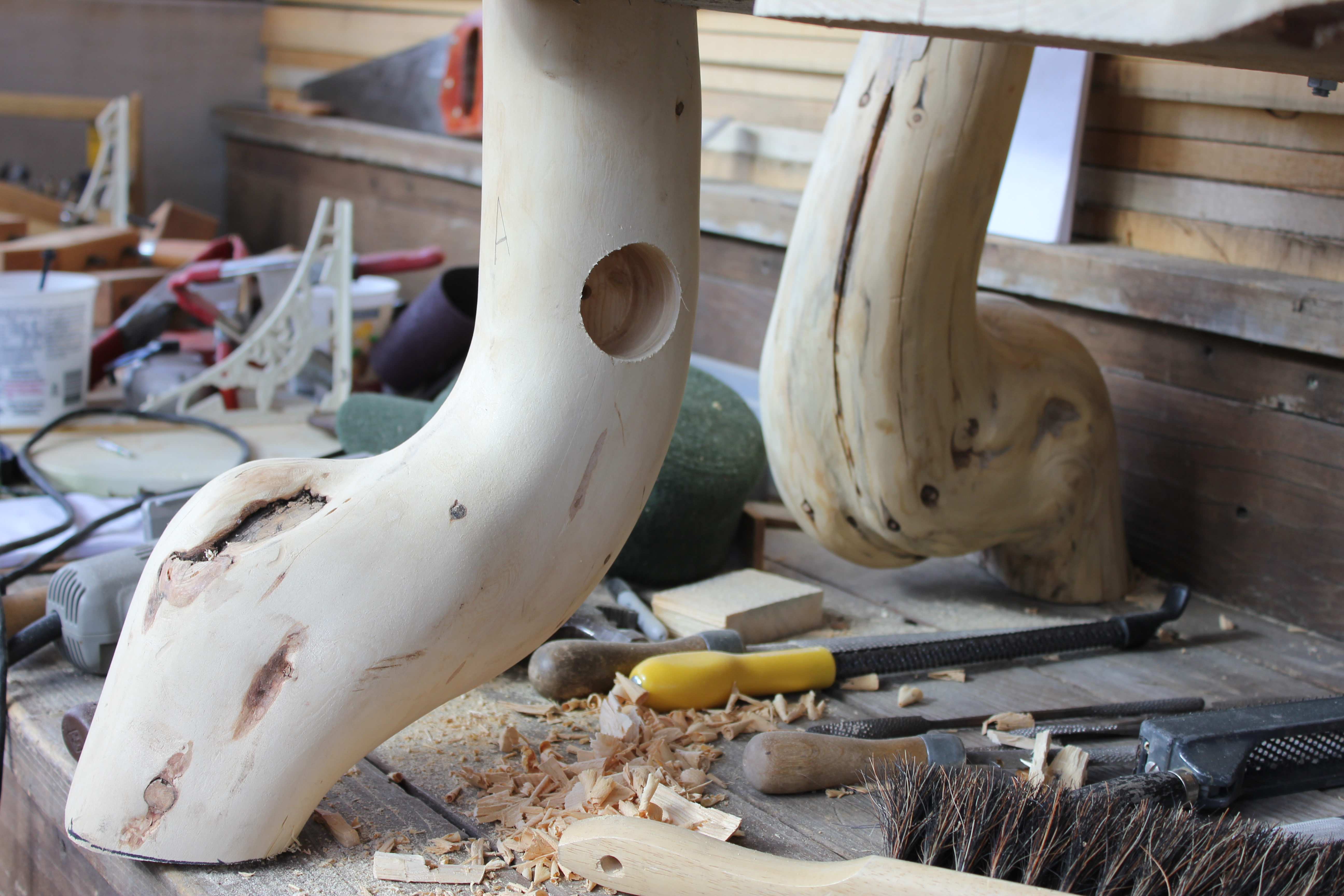 I’ve selected four swan neck pieces for the bench legs. In this photo, I’ve placed one of them to explore options for joinery that connects the leg to both the top and the bottom of the back rest.