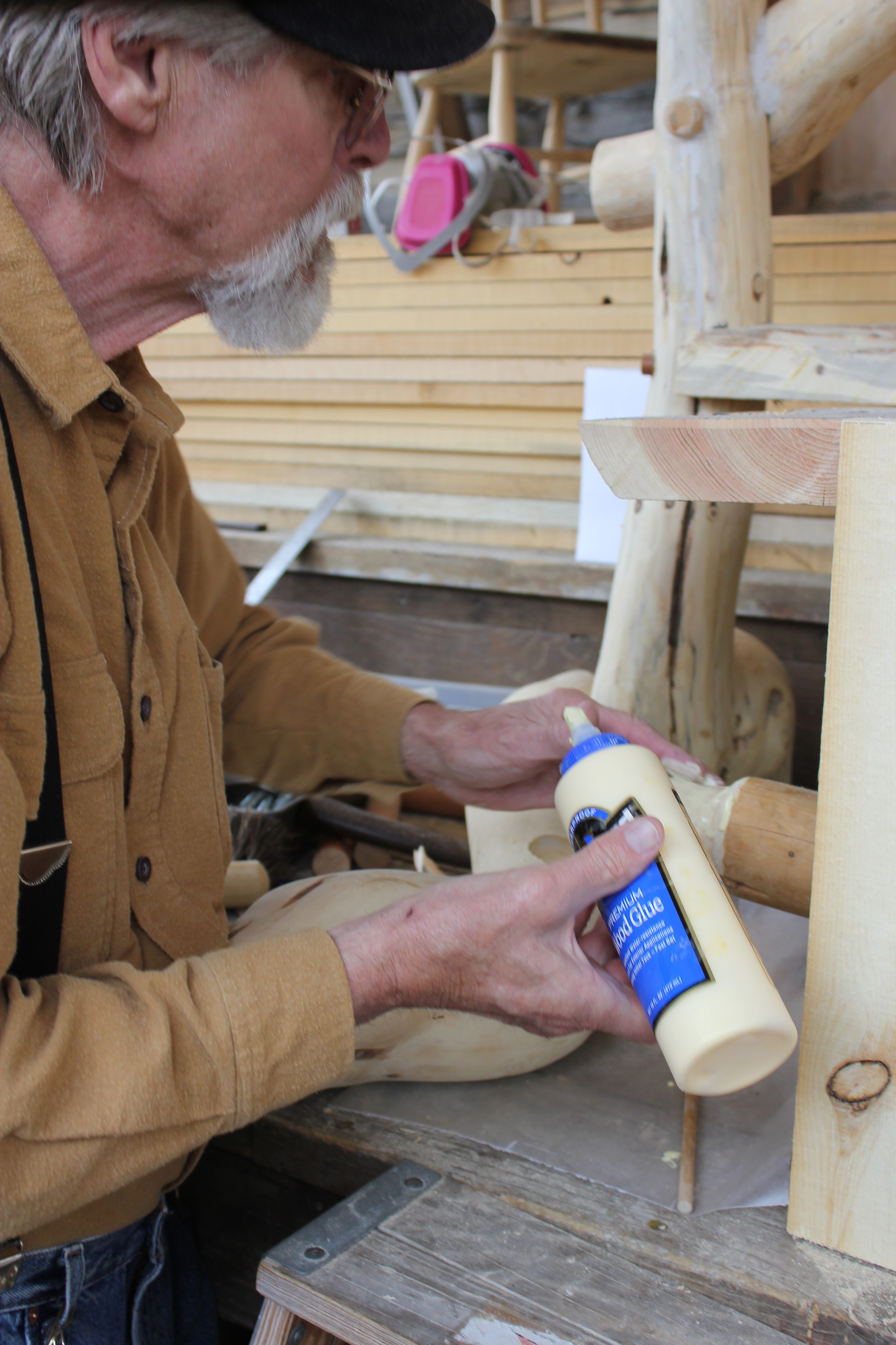 An important reason for my wanting to exhibit at the fair was/is my admiration for the octagonal log architecture of “The Pavilion.” Another reason is that our three families all live just across the Beaverhead River from the fairgrounds. Yet another reason is that the booth space was large enough to allow a collection of 11 pieces of furniture, as well as my shaving horse, tote box, and tool caddy.