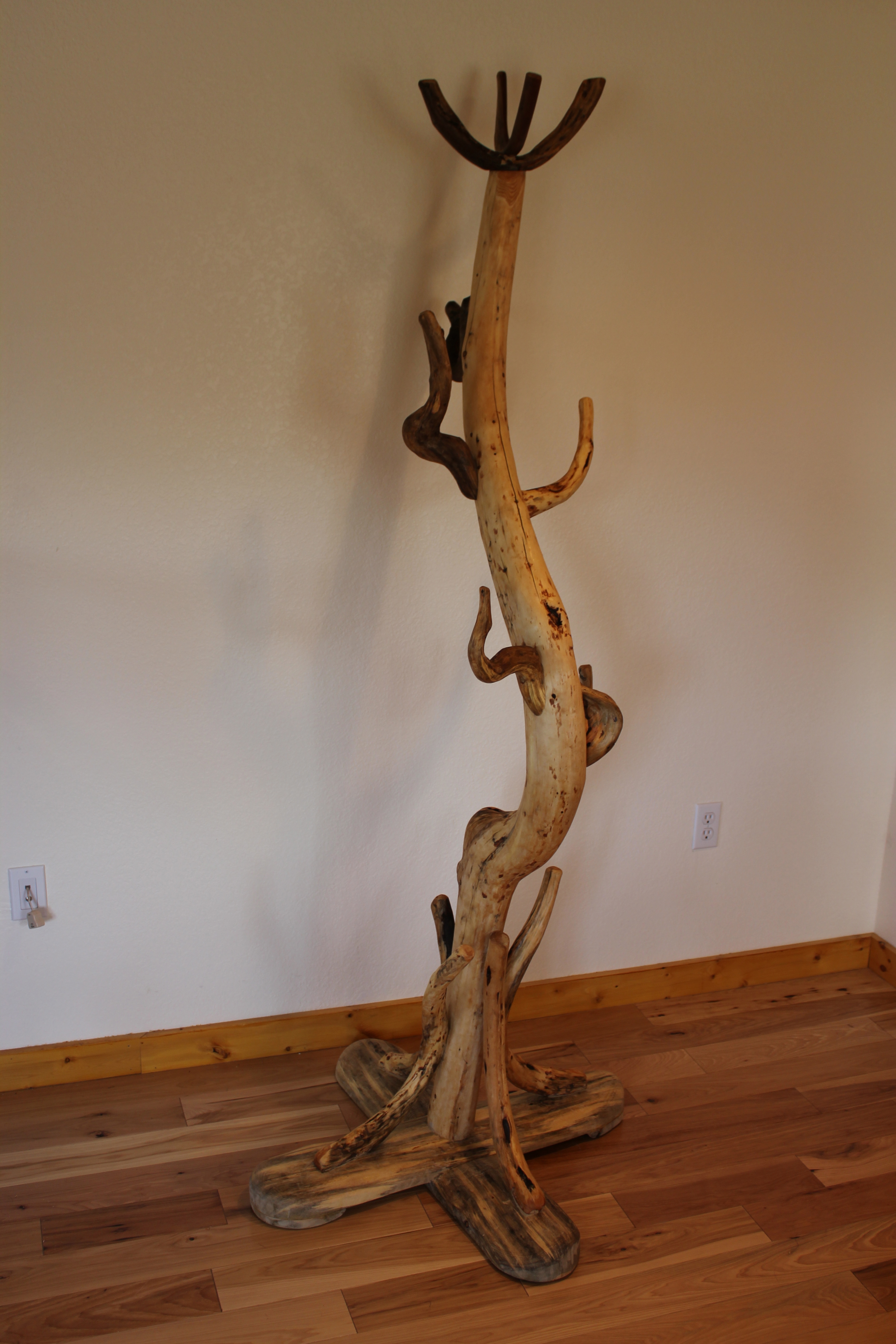 The height is over six feet. Except for the two slab pieces of the base, the rack combines twelve lodgepole pine tree trunks (and limbs?). The large central tree is a “swan’s neck,” my favorite contorted lodgepole pine motif. All of the hooks were “mate-cut” to fit flatly and tightly to the central tree, and joined with trim head Torx screws. I’ve included two close-ups of the joinery, that also show insect activity and other “character traits.”