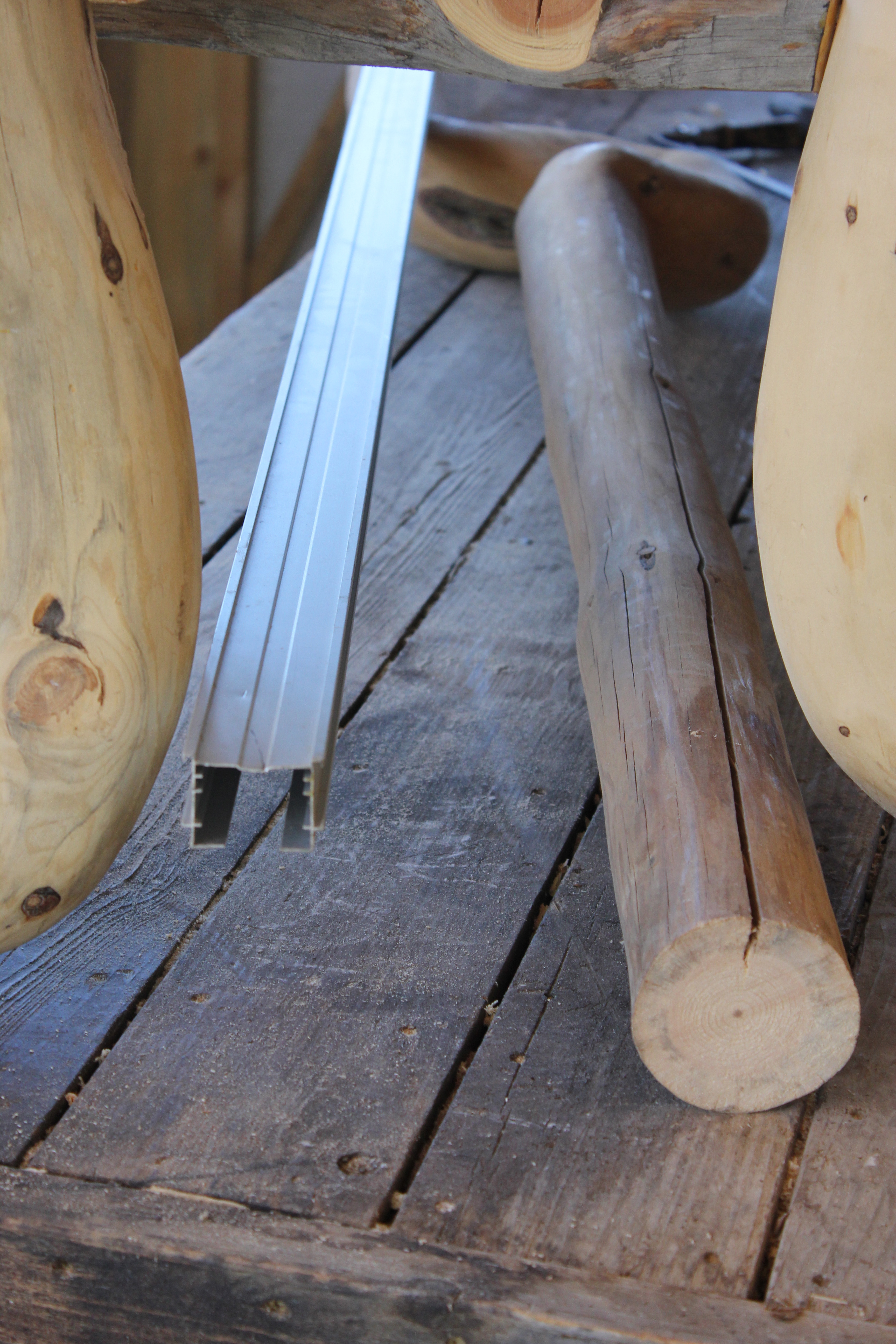 Getting started by selecting component pieces, each a lodgepole pine tree trunk–four “swan’s necks” and one “tuning fork”.