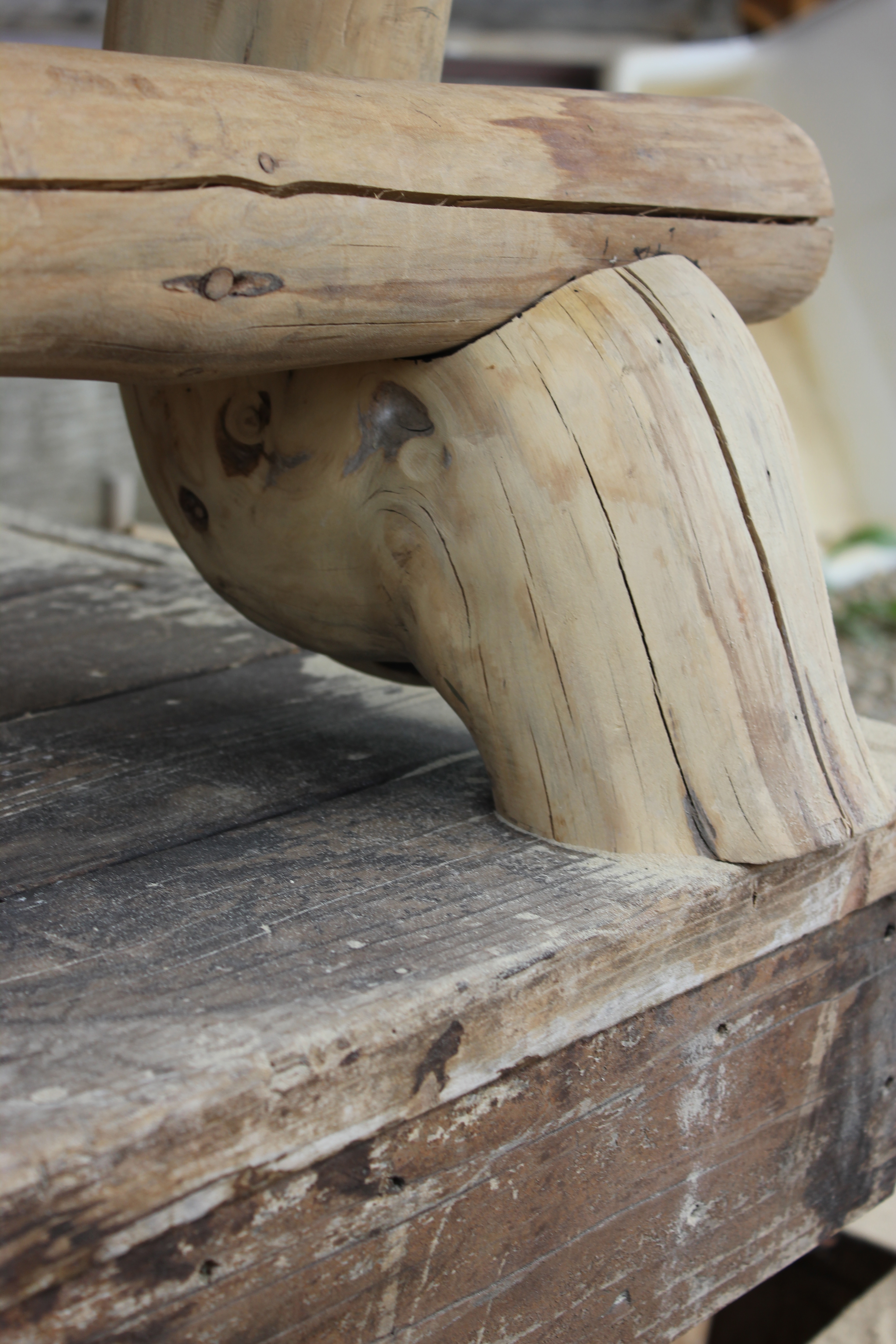 This close-up shows the armrest support brace, made of a segment cut from a little tree trunk naturally grown in an arched curve. For added strength, it is inset both into a recess in the front leg, and into a groove chiseled in the armrest. It is secured with Torx finish screws.